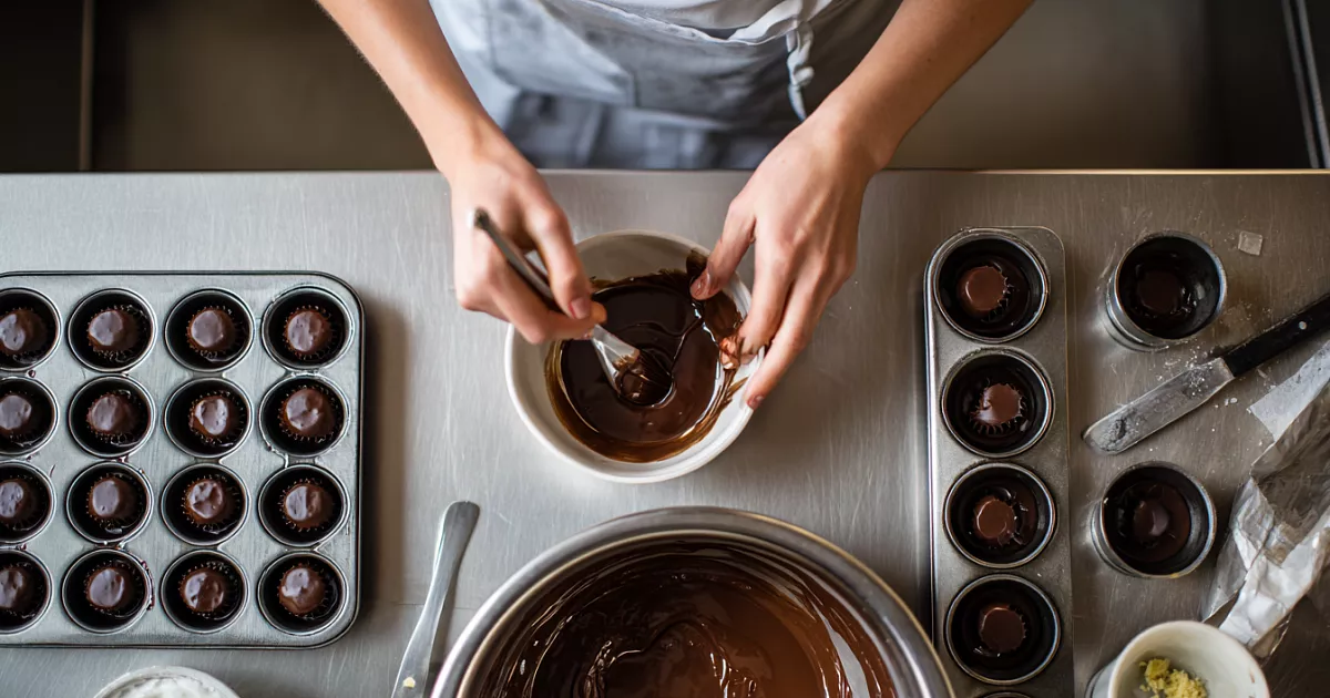 Молочный шоколад растопите на водяной бане до гладкости. Формы поставьте на доску, застеленную пергаментом. В каждую ячейку влейте ложку шоколада, прокрутите форму, переверните и дайте стекать — так стенки покроются равномерно. Уберите на 5–10 минут в холодильник, затем тонким слоем «докрасьте» проплешины и вновь охладите. Важно: шоколад не разводите маслом; белый шоколад капризный — его плавят короткими импульсами и не перегревают.