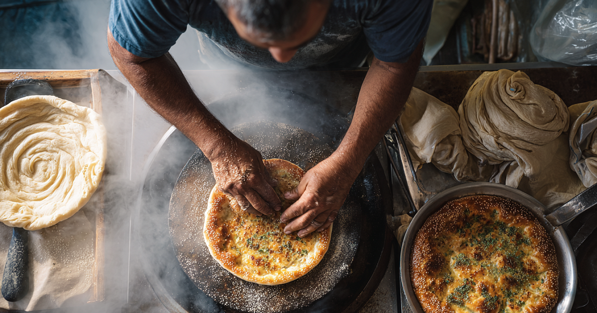 Вода/кефир должны быть тёплыми — палец терпит. Муку просеивайте порциями, тесто вымешивайте до гладкости 7–10 минут. Расстойка в тепле до увеличения в 2 раза. Выпекание — на минимальном/среднем огне под крышкой; переворот через пергамент.