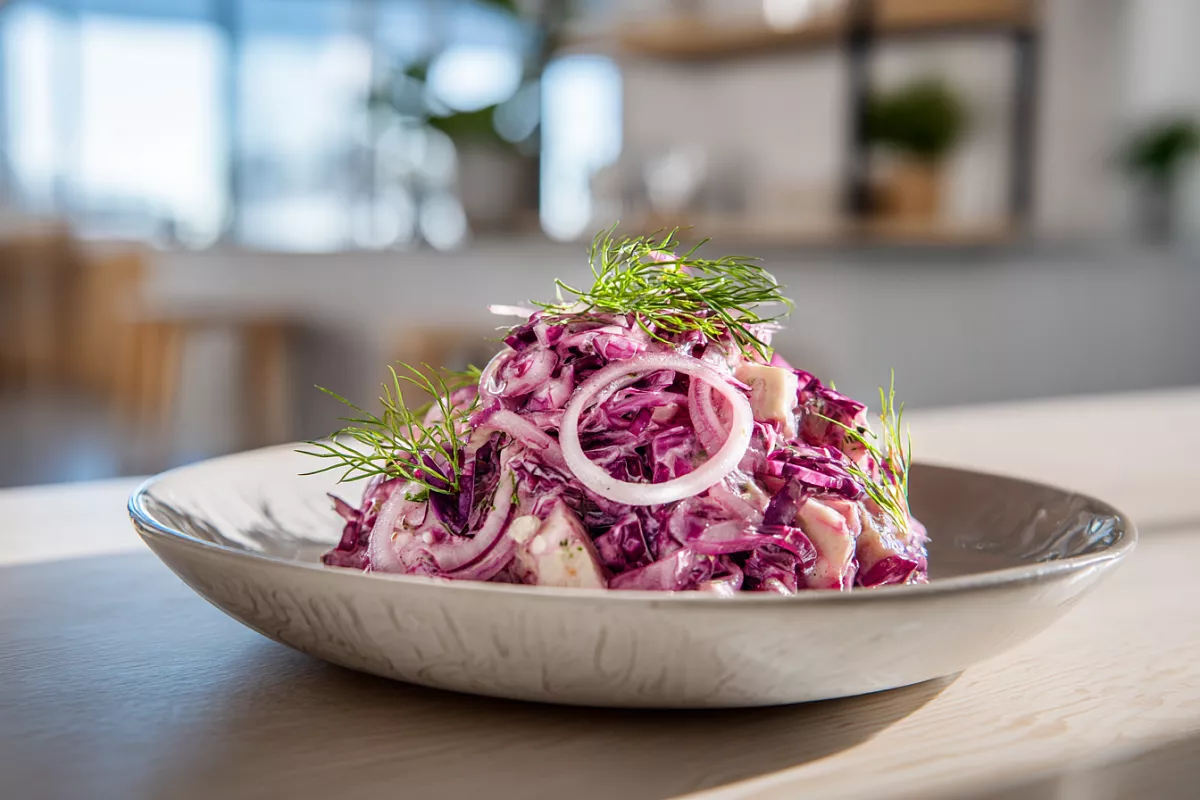 Нарежьте 1 красную луковицу на четвертинки колец. Замаринуйте её в 1 ст. л. яблочного или винного уксуса с 0,5 ч. л. сахара, хорошо перемешайте и оставьте на 10 минут. Возьмите 2 варёные или запечённые свёклы (400 г), натрите или нарежьте кубиками по желанию. Филе сельди (2 шт., 130 г) нарежьте тонкими ломтиками, соразмерными свёкле. Добавьте 50 г корня сельдерея, натёртого на тёрке — он придаёт салату особую нотку и пользу.