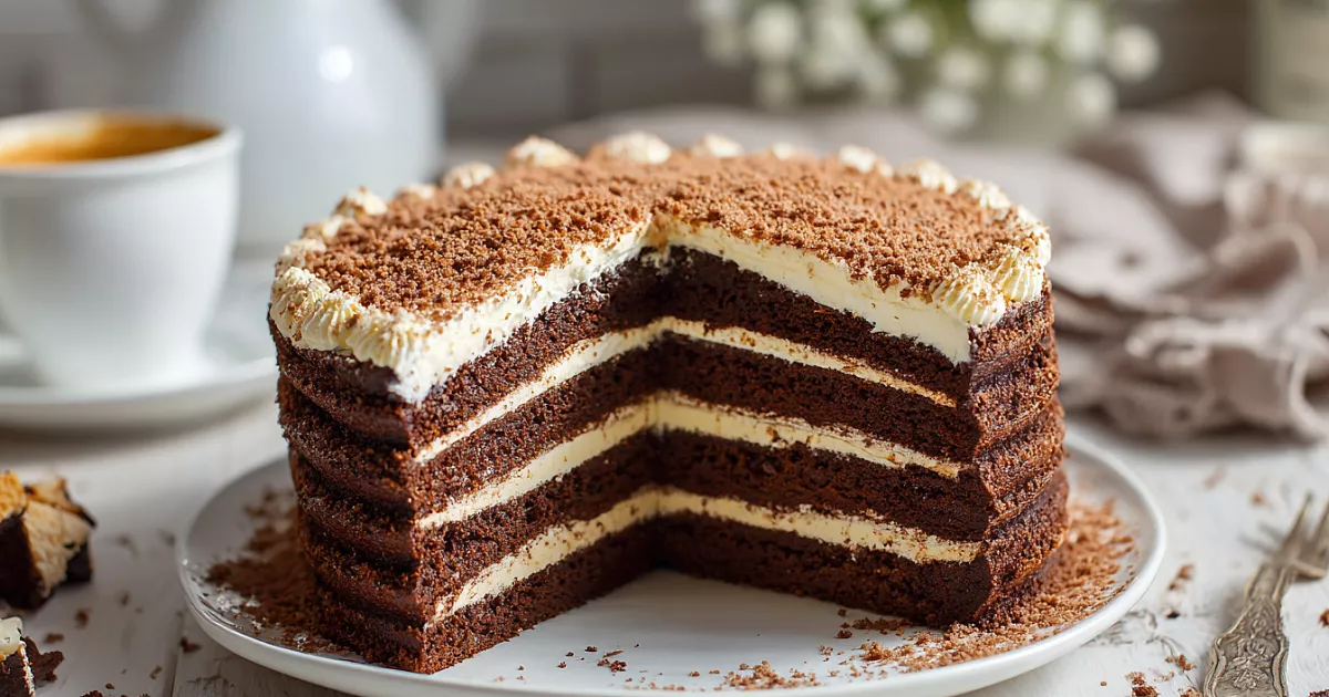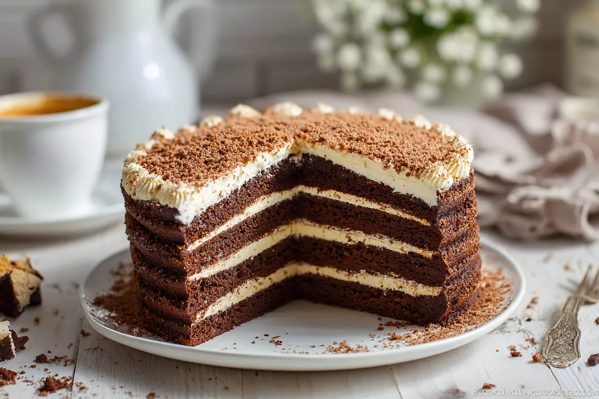 Просейте 260 г пшеничной муки с 10 г разрыхлителя и 10 г какао. В миске смешайте венчиком 2 яйца, 200 г сахара, щепотку соли, 130 мл молока и 50 мл растительного масла. Добавьте 1 ч. л. соды, гашёной 1 ст. л. 9% уксуса, и щепотку ванилина. Всыпьте муку, перемешайте. Влейте 100 мл кипятка, доведите тесто до жидкой консистенции. На сковороде на среднем огне с каплей масла выпекайте 6 тонких коржей по 2–3 минуты с каждой стороны под крышкой. Остудите.