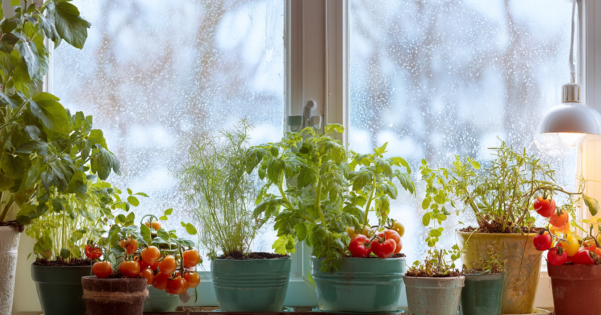 Сейте пораньше, чтобы к зиме уже собирать плоды. Для томатов и перцев обеспечьте 14–16 часов света — южный подоконник или фитолампы. Поливайте умеренно тёплой водой, подкармливайте раз в 2 недели биогумусом или комплексными удобрениями. Зелень не требует больших горшков, а для томатов и огурцов берите ёмкости 3–10 л в зависимости от сорта.
