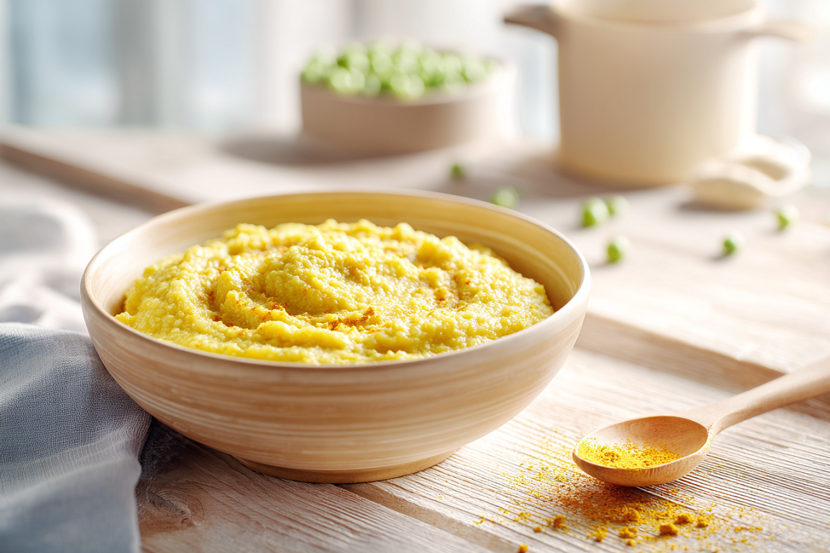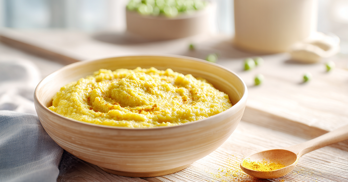 Через 15 минут проверьте: если вода выкипела, добавьте ещё холодной, доведите до кипения. Когда горох разварится (примерно через 30–35 минут), посолите по вкусу, добавьте щепотку куркумы (по желанию) для аромата и пользы. Взбейте блендером прямо в кастрюле до однородного пюре, не поднимая блендер, чтобы избежать брызг. Подавайте как пюре или охладите для начинки в пирожки.