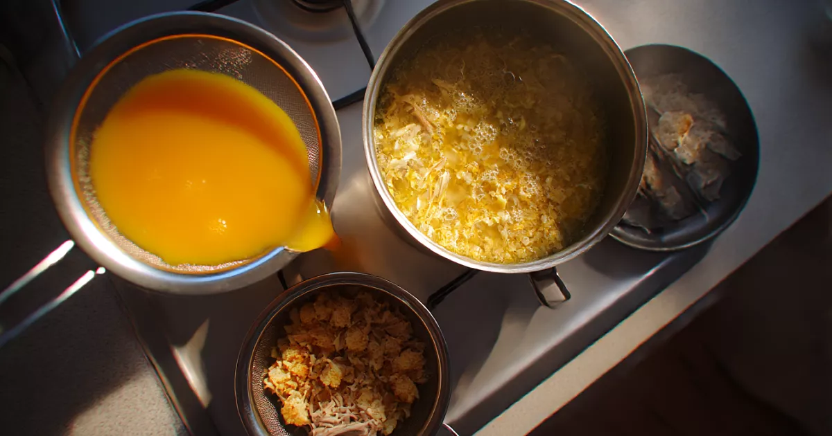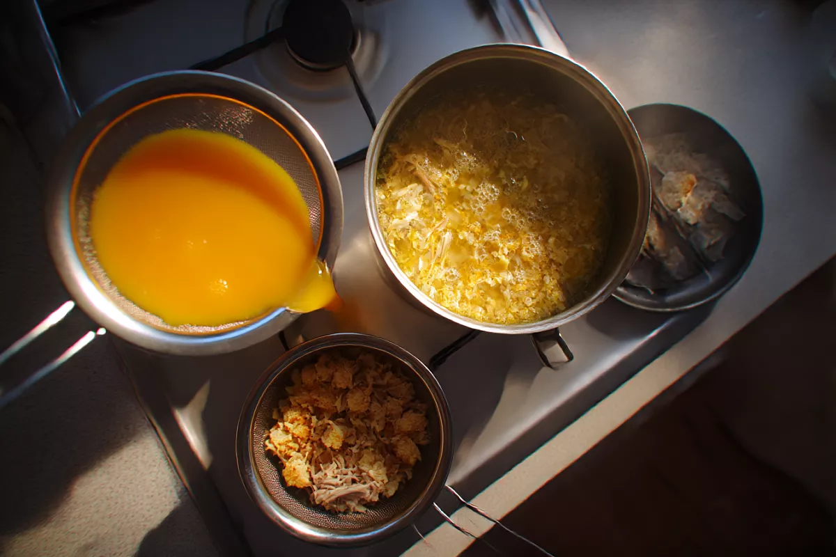 Если хочется особенно привлекательного цвета, действую как на хорошей кухне: выжимаю морковный сок (мякоть натёртой моркови заливаю чуть-чуть водой, отжимаю) и процеженным соком «подкрашиваю» суп. Он мгновенно становится оранжевее и аппетитнее. Консистенцию довожу водой до любимой густоты — бульон уже насыщенный, вкус не потеряется.
