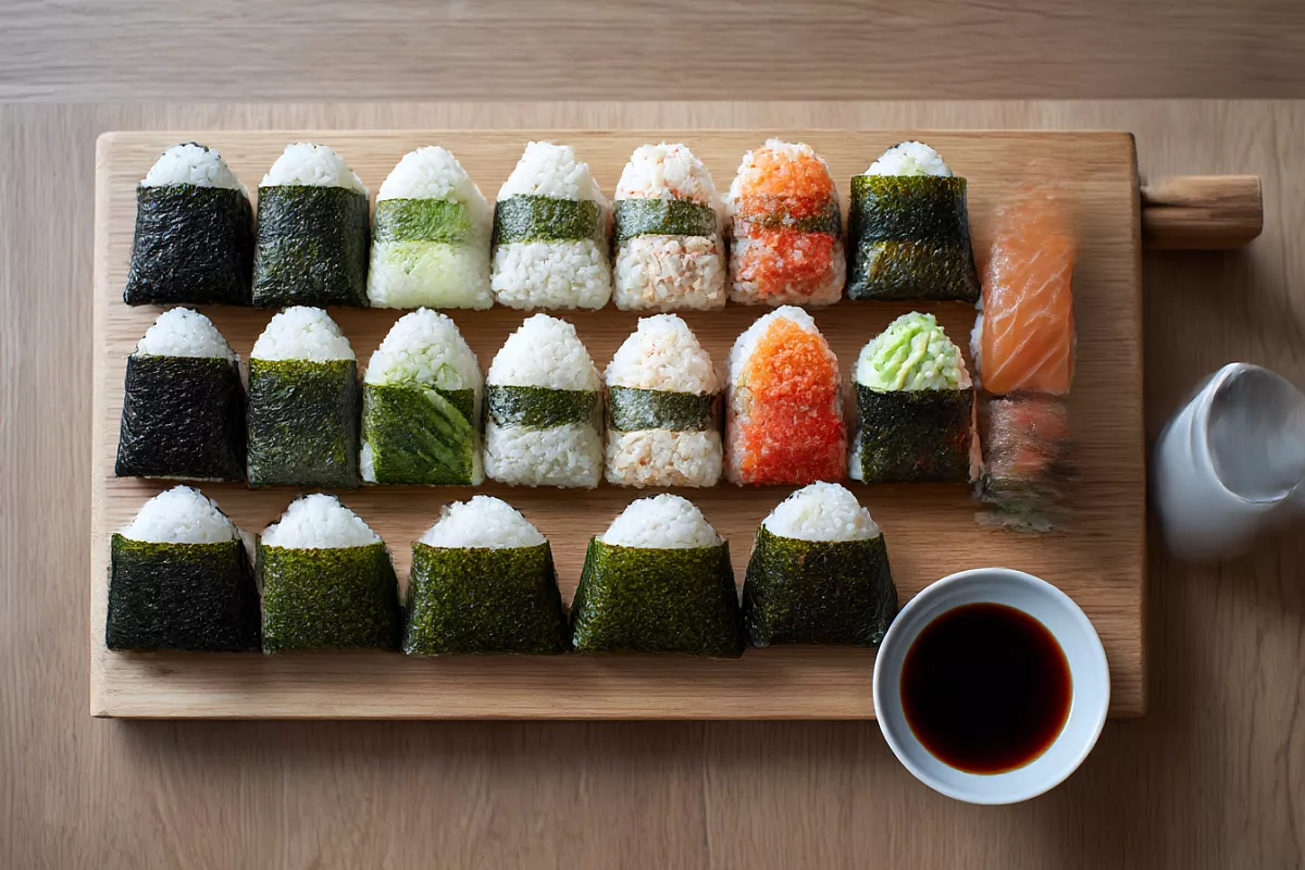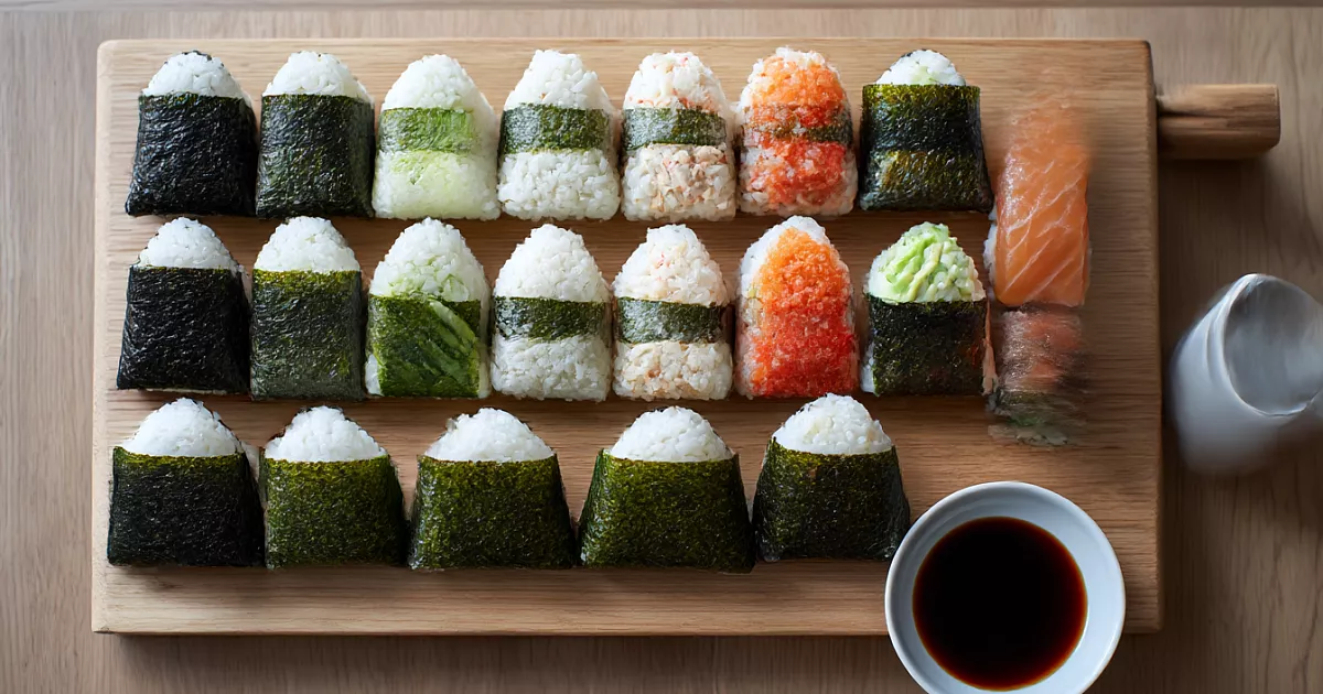 Небольшие треугольники риса с сердцем из рыбы или краба — удобный перекус, который легко собрать на домашней кухне.