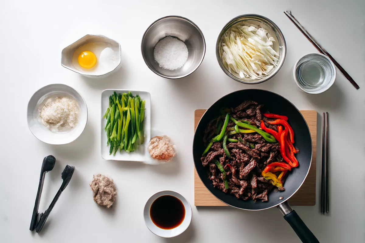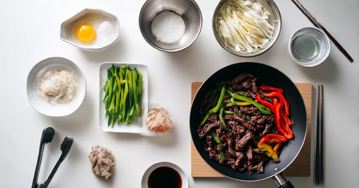Тонко нарезанная говядина, яичный маринад и густой соус на крахмале — ужин за несколько минут на обычной сковороде.