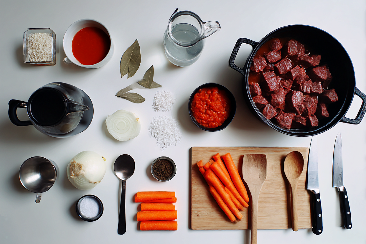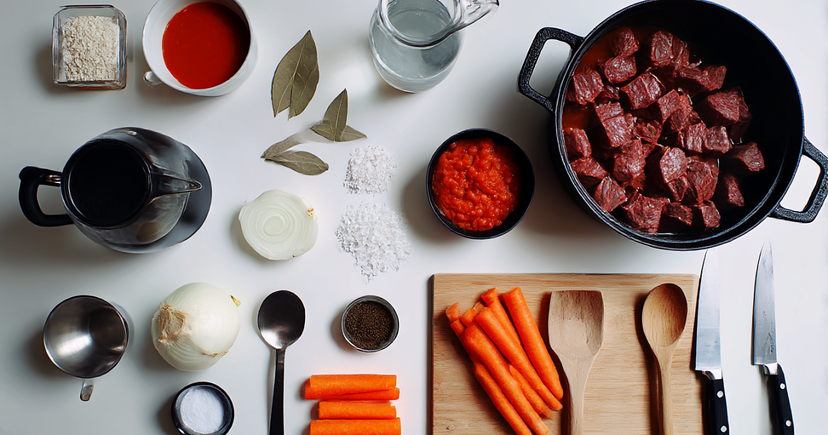 Нарезаем морковь брусочками, лук четвертькольцами, говядину небольшими кусочками. Обжариваем мясо до лёгкой румяности, чтобы пошёл аромат, добавляем лук и морковь и доводим до мягкости. Для густоты вводим муку и обязательно прогреваем её, иначе будет вкус сырого теста. Следом томатная паста — несколько минут на хорошем жаре, пока кислота уходит и появляется сладость томата и ореховые нотки от муки. Вливаем тёплую воду, подсаливаем, балансируем щепоткой сахара, добавляем лавровый лист и перец. Тушим под крышкой до мягкости мяса, в конце регулируем густоту теплом или водой. На следующий день вкус ещё глубже, но удержаться сложно — густые пузырьки и запах сразу зовут к столу.