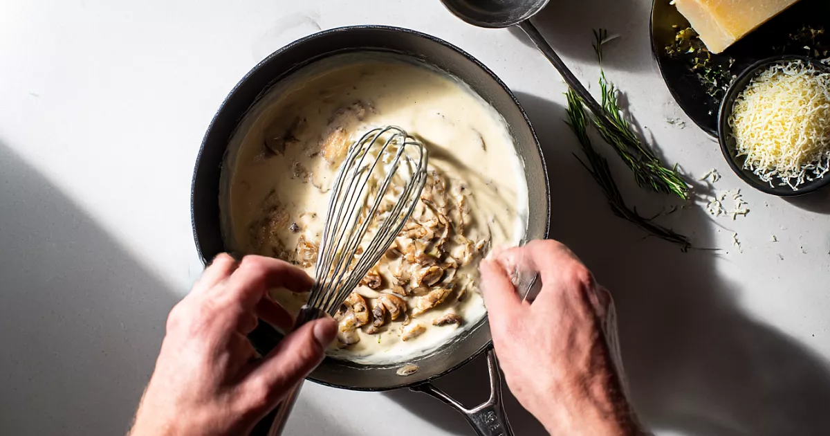 В сотейнике растопите сливочное масло, добавьте муку и, помешивая, прогрейте около 5 минут до орехового аромата. Частями влейте молоко, активно работая венчиком, чтобы не образовались комочки; через 2–3 минуты соус начнёт густеть. Приправьте солью, перцем и щепоткой мускатного ореха. Совет: молоко вводите понемногу — так консистенция получится гладкой.