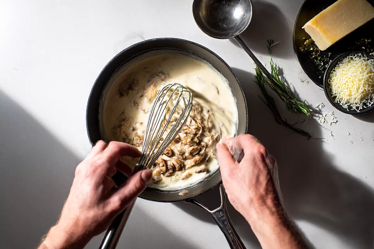 Разогрейте оливковое масло с кусочком сливочного. На огне чуть выше среднего доведите лук до полупрозрачности, всыпьте розмарин и дождитесь лёгкой золотистости. Добавьте курицу, перемешайте, приправьте щепоткой соли и перца и обжарьте около 2 минут на сильном огне — так мясо схватится и останется сочным.