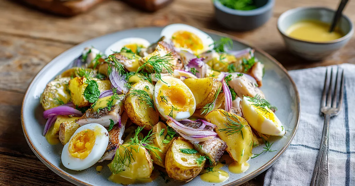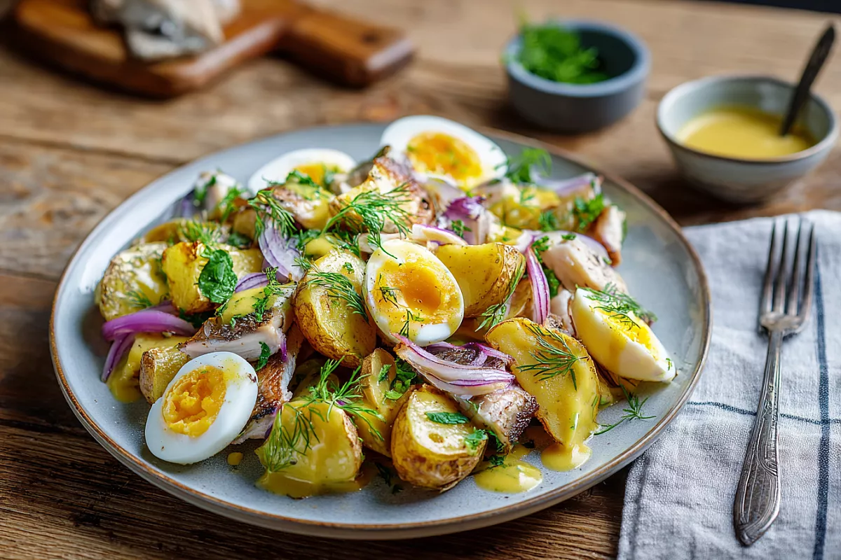 Не просто «селёдка под шубой», а ресторанная подача: жареная картошка в мундире, яйцо 5-минутка, красный лук и заправка, от которой не оторваться.
