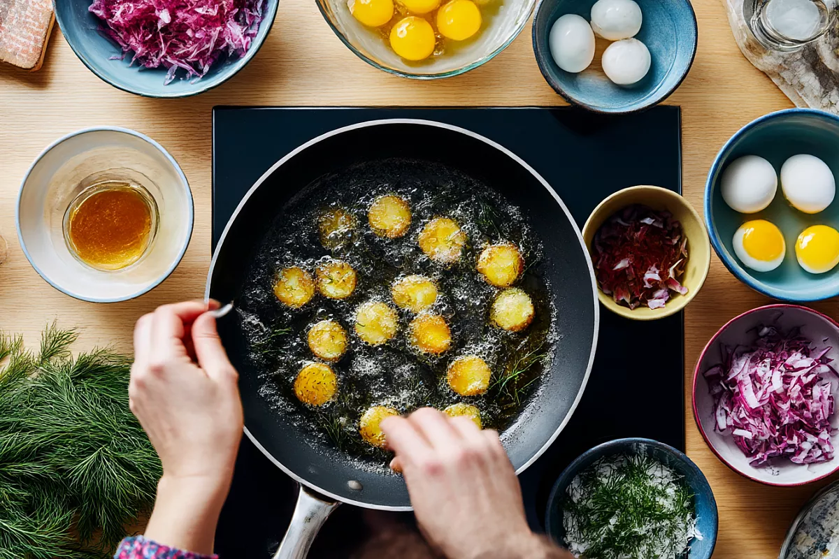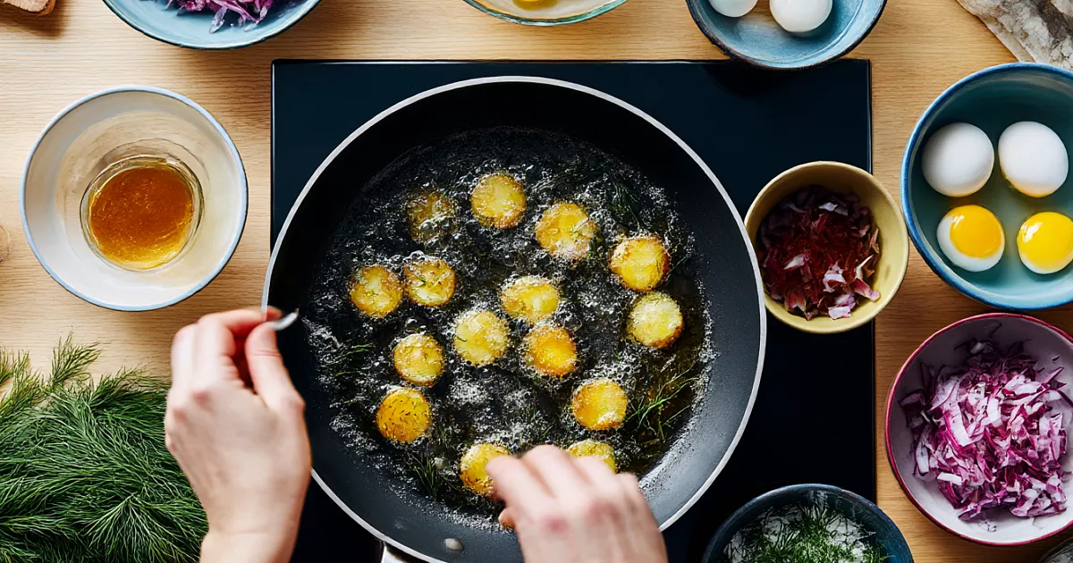 Запах свежесваренной картошки для меня — про тепло и уют. Зимой дома кастрюлю только снимут, а мы ещё и «дыхнём парком», чтоб согреться, потом едим горячую с укропом. Картошка и правда всему голова. Потому и здесь она не холодная, а чуть поджаренная, румяная, с корочкой. Яйца — мягкие, как в ресторане, а заправка с мёдом, красным винным уксусом и зернистой горчицей даёт тот самый бодрый вкус, под который селёдка раскрывается лучше всего.