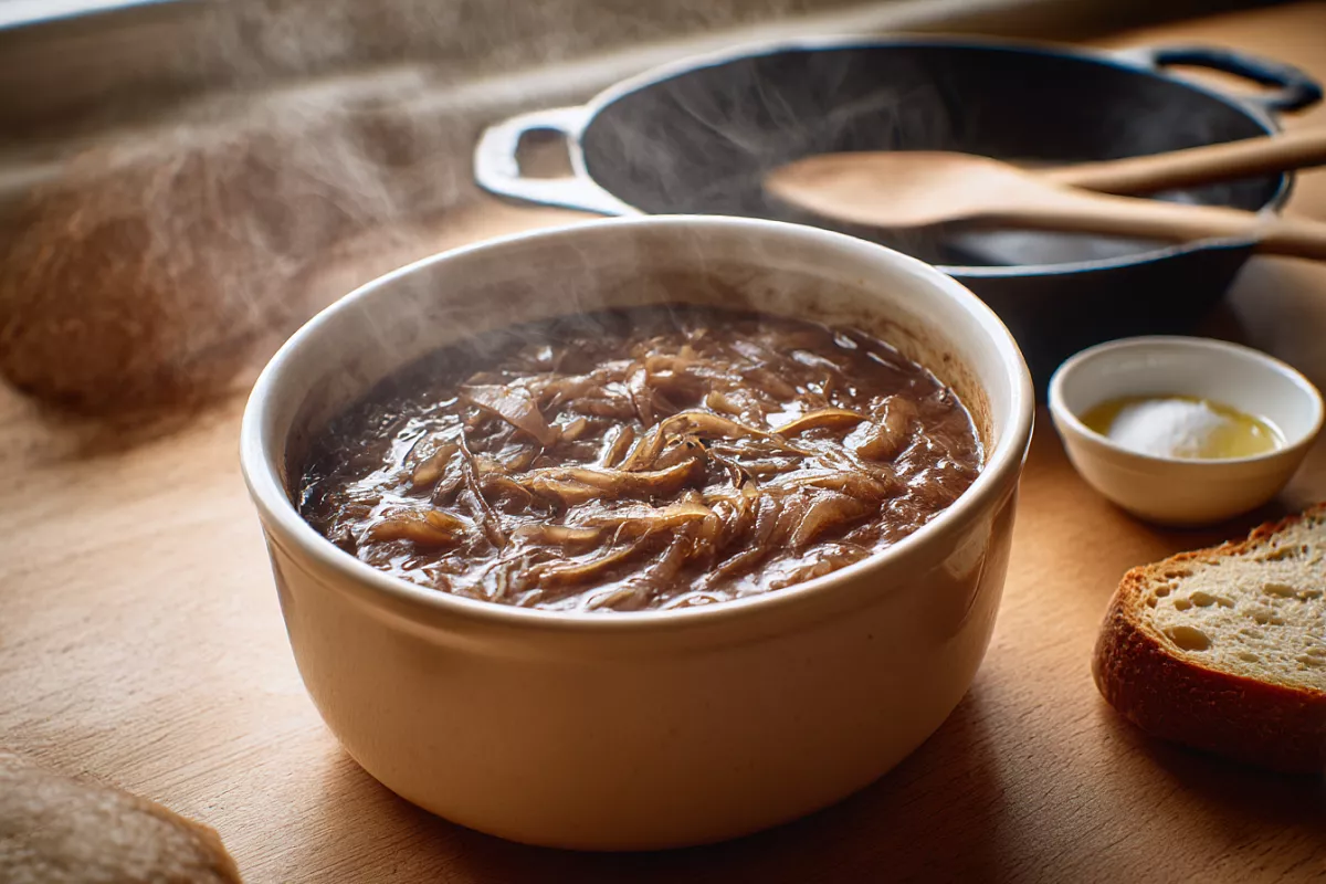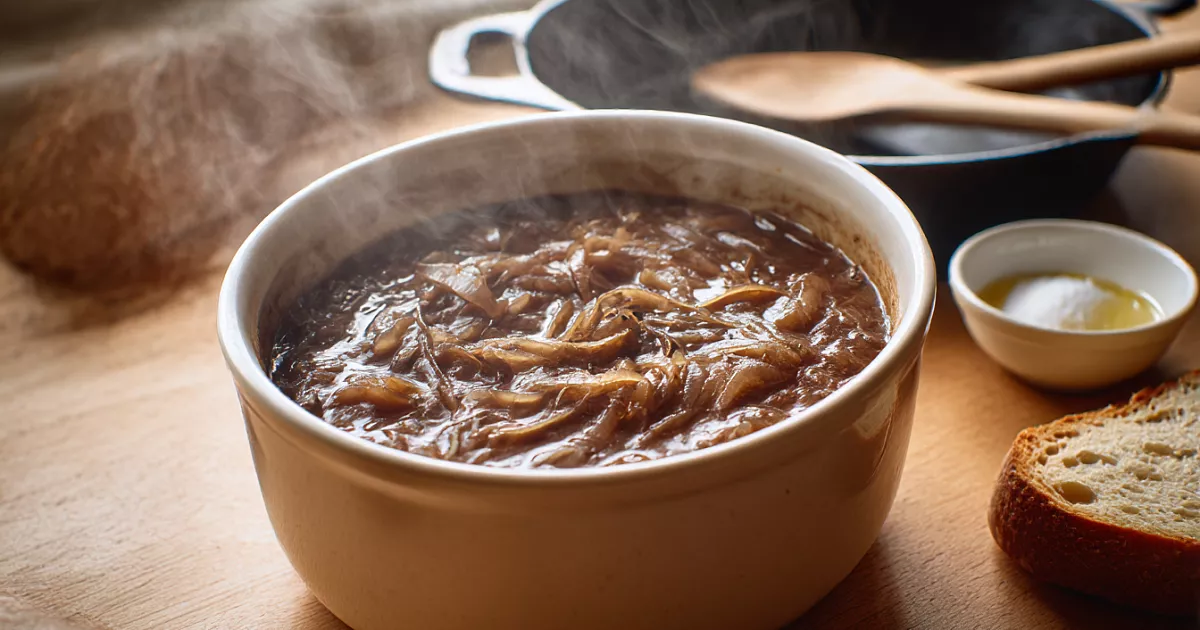Лук, масло, кипяток и кусочки хлебной корки — старинный способ получить насыщенный, согревающий суп без бульона.