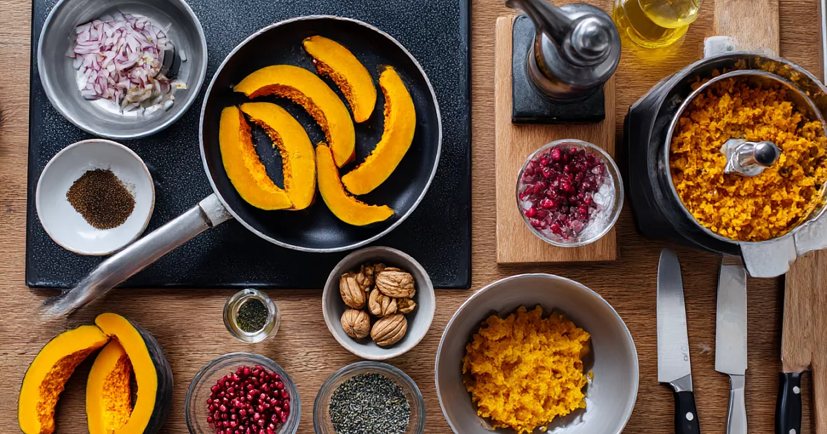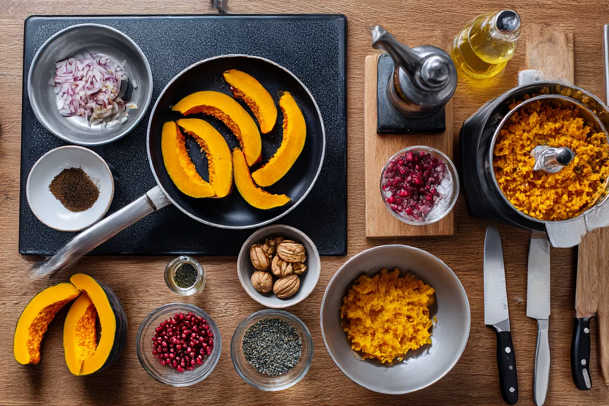 Тыкву запекают до мягкости при 170 °C и дают немного остыть, лук с чесноком обжаривают до лёгкой румяности, чтобы ушла резкость. Орехи прокручивают первыми, следом — лук с чесноком, а мякоть тыквы просто разминают вилкой. Вкус собирают специями: уцхо-сунели или хмели-сунели, щепотка острого перца, немного чёрного, кислинка уксуса или лимона и, по желанию, горсть кислых сушёных ягод. Любая тыква подойдёт: чем она слаще, тем слаще получится закуска. Финальный штрих — формуем небольшие «лепёшечки» и посыпаем гранатом.