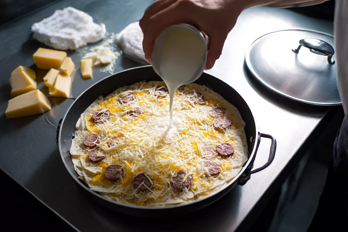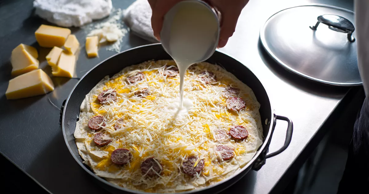 Не спешите и держите маленький огонь — лаваш успеет схватиться снизу, а середина останется сочной. Яично-молочную смесь распределяйте до самых краёв. Если хочется более диетичного варианта, заготовку можно запечь в духовке до подрумянивания.