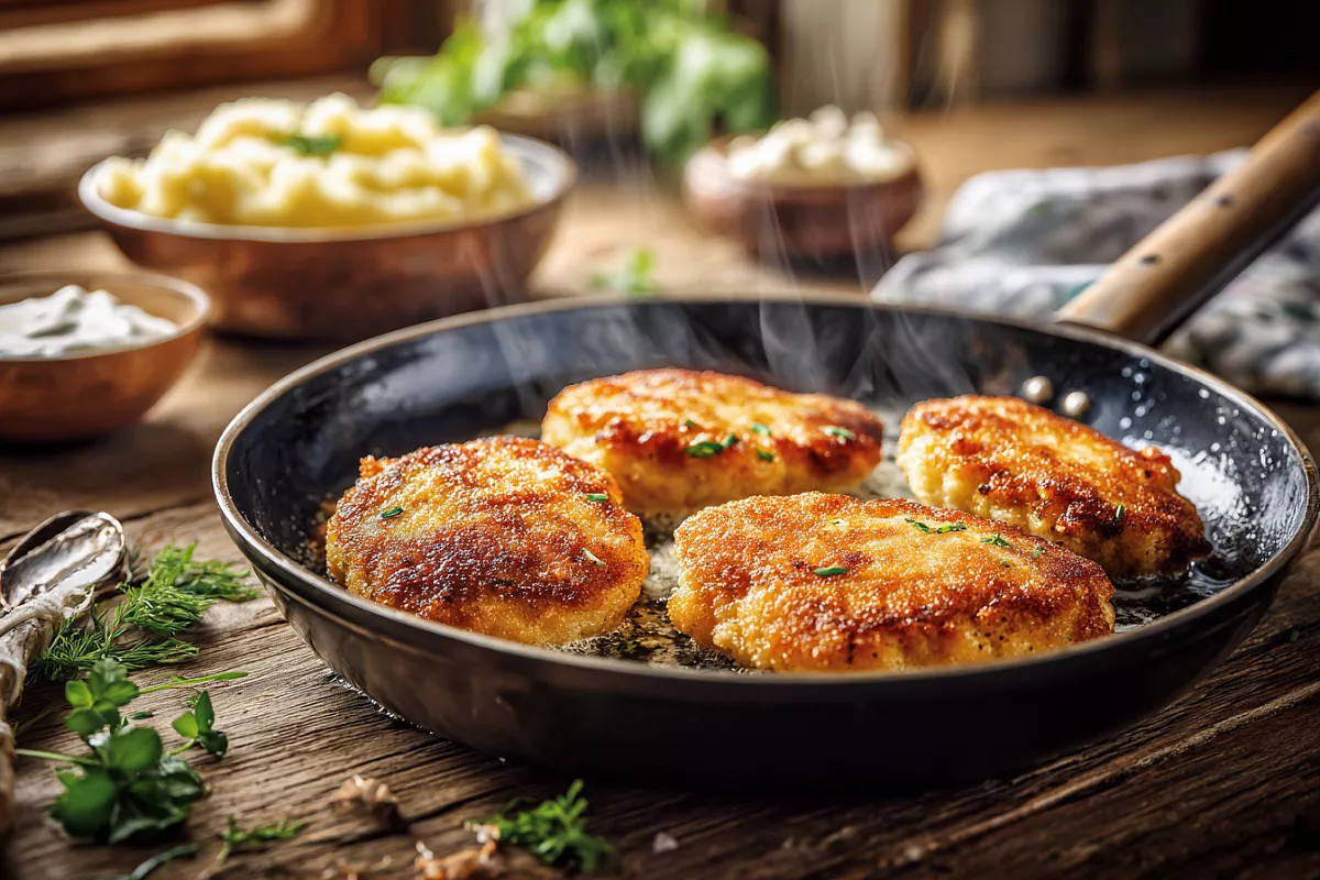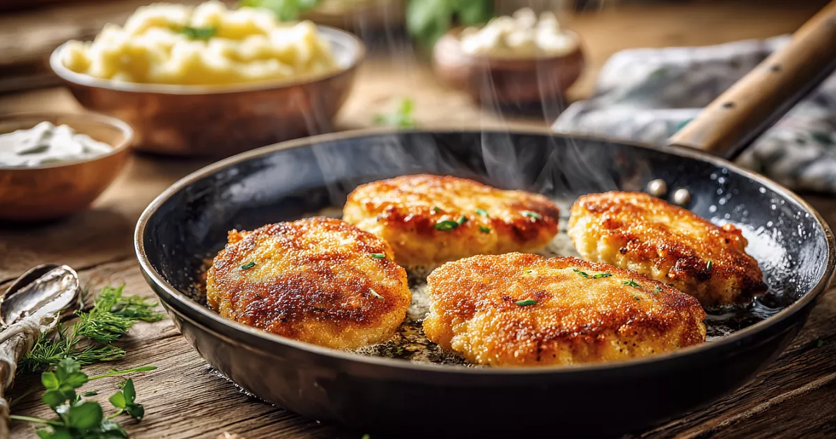 Жарим на среднем огне под крышкой. Переворачиваем, когда низ подрумянится. Доводим до золотистой корочки с обеих сторон, переворачивая по необходимости. Подаём горячими с картофельным пюре.