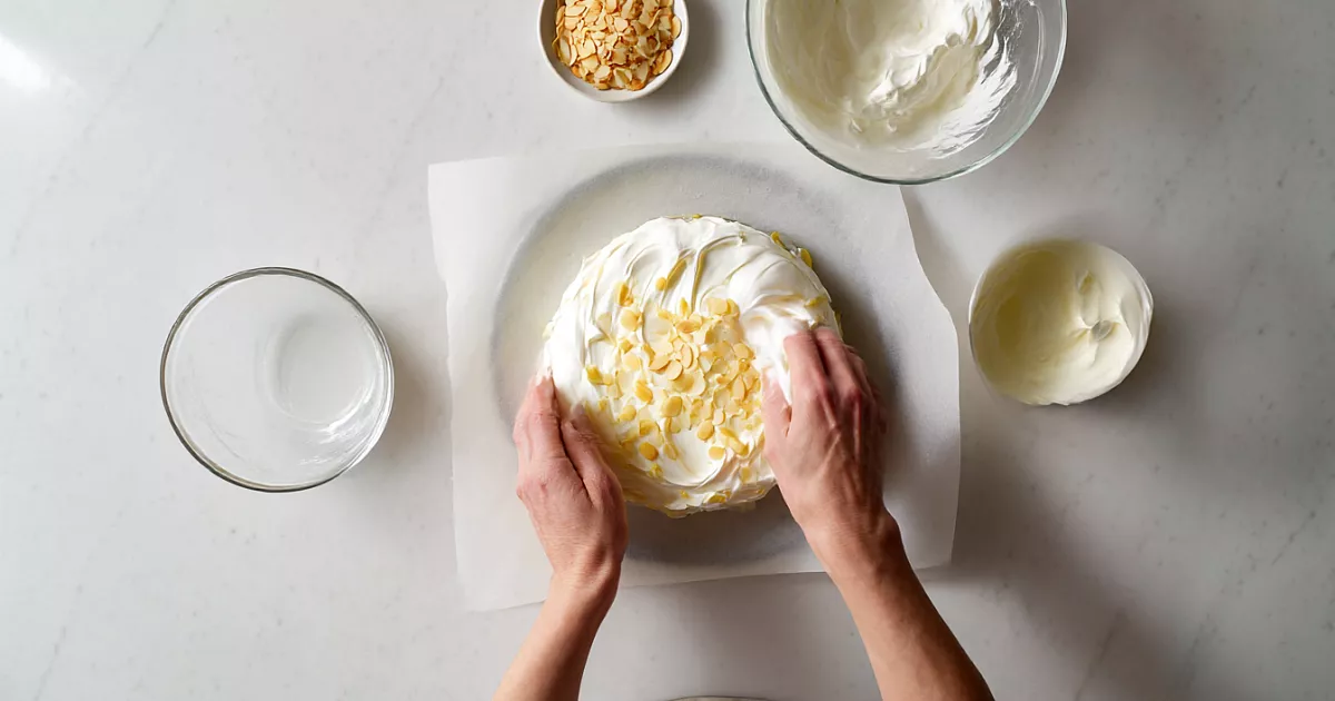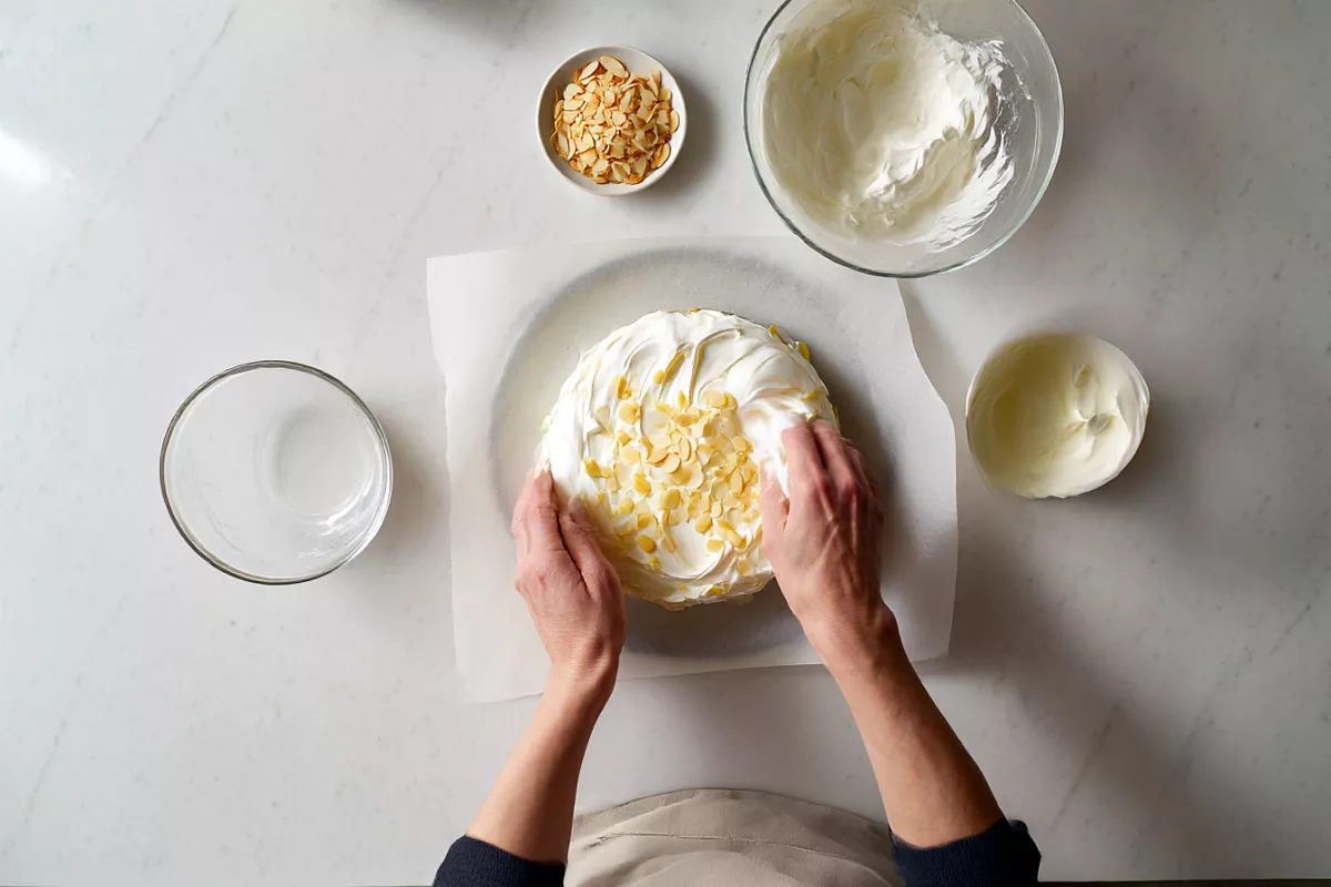 Торт с миндалём, хрустящей меренгой и воздушным кремом: готовится просто, а результат — нежный и очень эффектный.