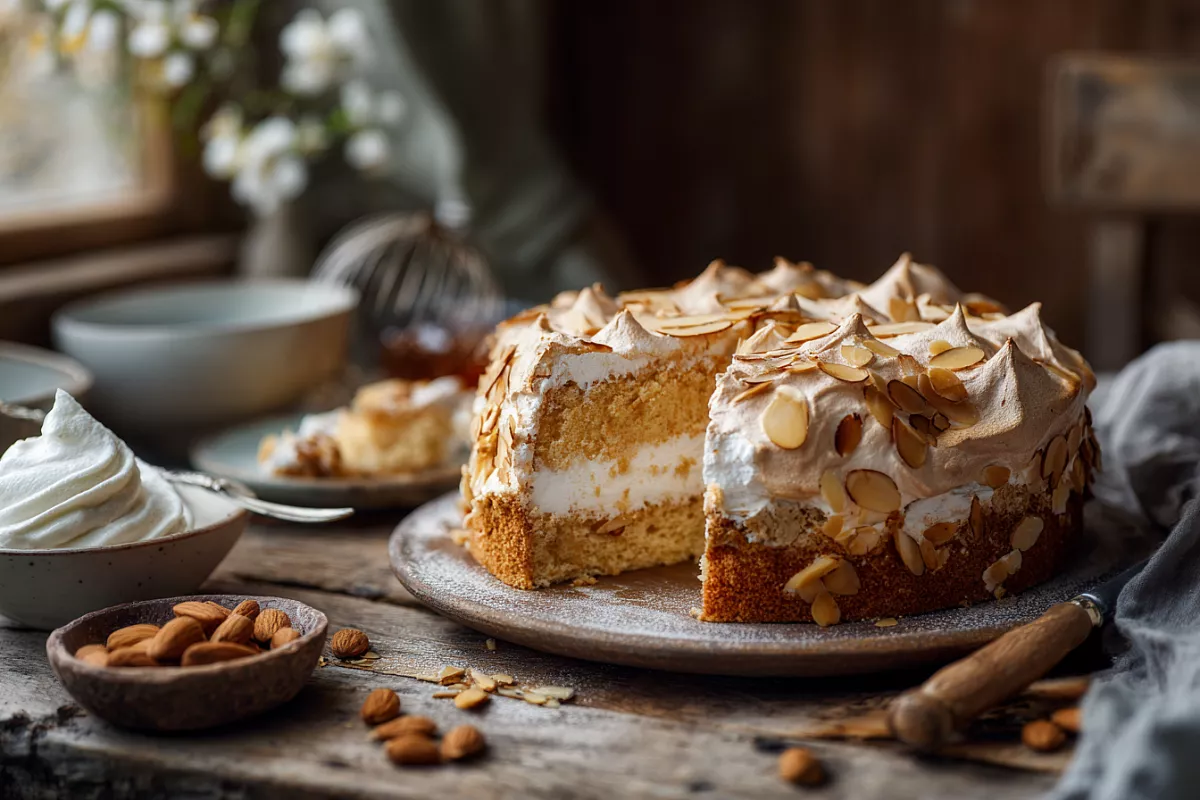 Распределяем тесто по пергаменту равномерным слоем. Взбиваем 4 белка с щепоткой соли до пены, постепенно всыпаем 200 г сахара и 20 г крахмала. Взбиваем до плотных пиков. Выкладываем меренгу сверху, не доходя до краёв. Посыпаем 20 г миндальных лепестков.
