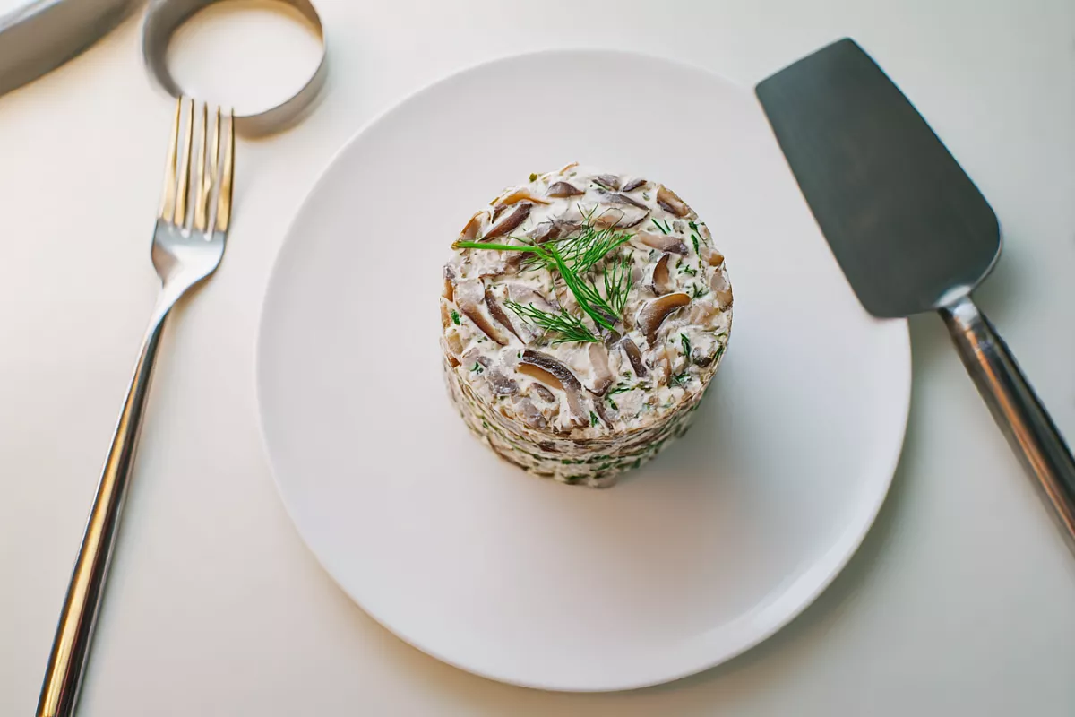 Удобно формовать в глубокой тарелке под салатное кольцо. Выложите и разровняйте слой грибов — это основание. Сверху распределите селёдку, аккуратно утрамбуйте лопаткой, чтобы слои держались.