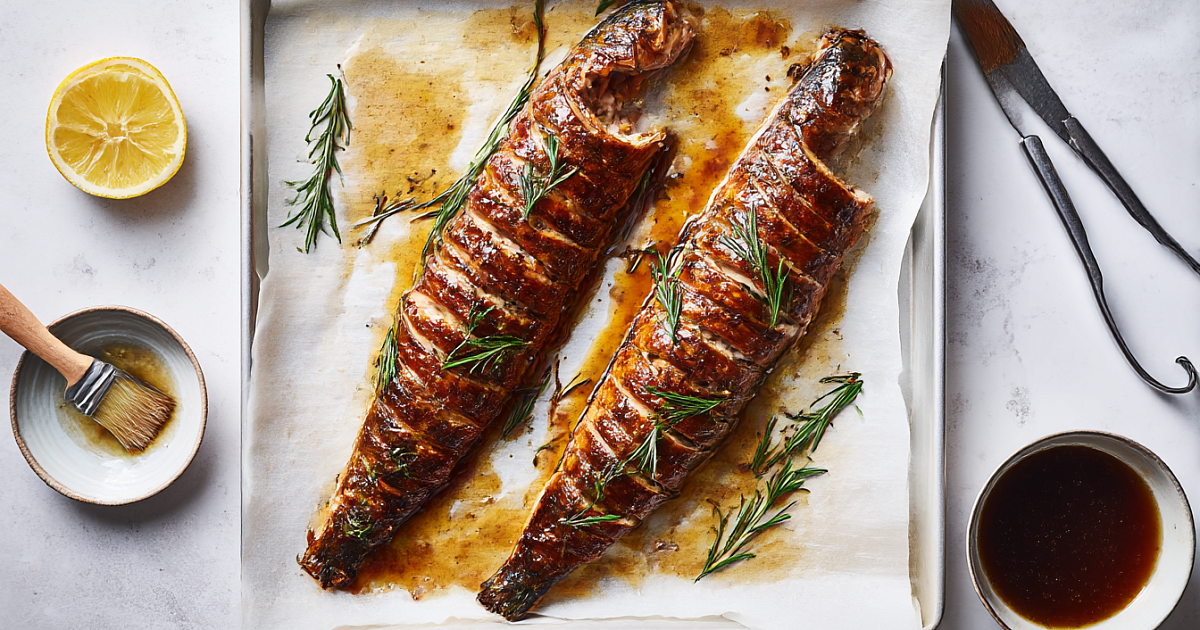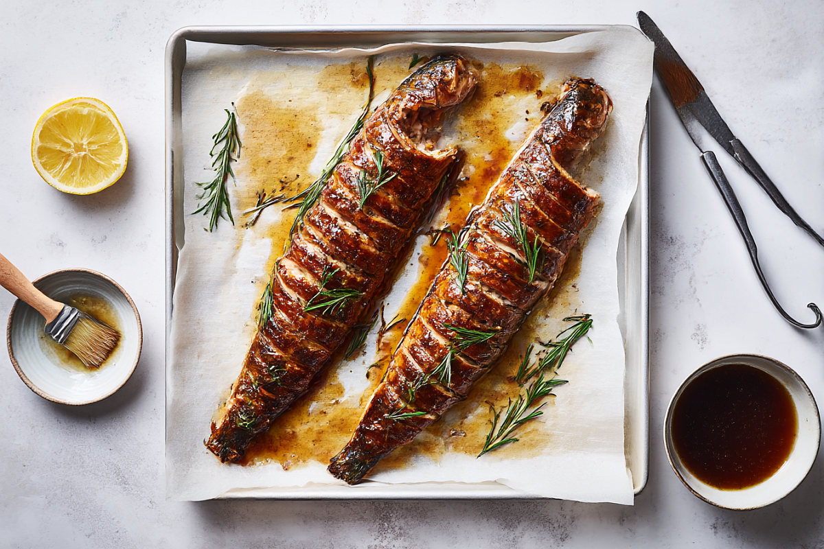 Смажьте рыбу маринадом с обеих сторон, часть маринада распределите сверху. Если время позволяет, оставьте на 30 минут — соки успеют впитаться, и вкус станет ярче. Духовку заранее разогрейте до 190 °C.