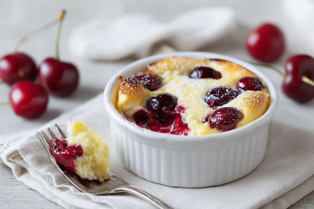 Готовый клафути ароматный, с кремовой текстурой и сочной вишней. Подаём тёплым с чаем или кофе.