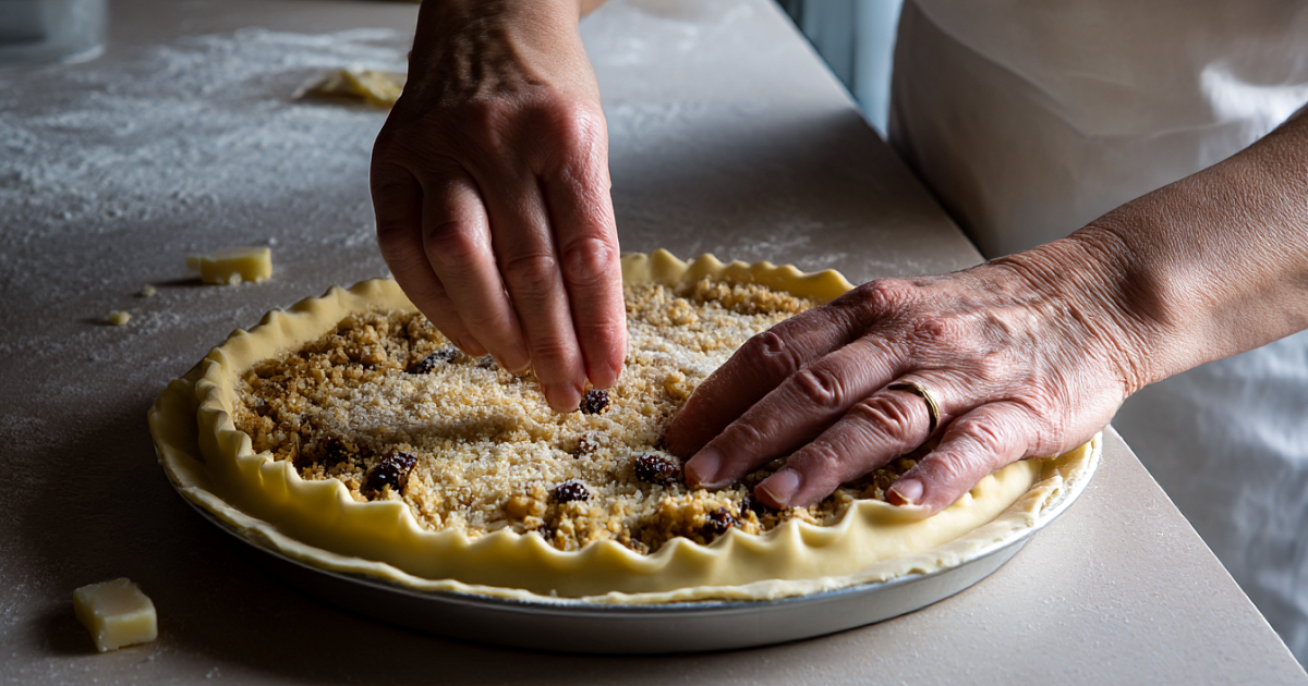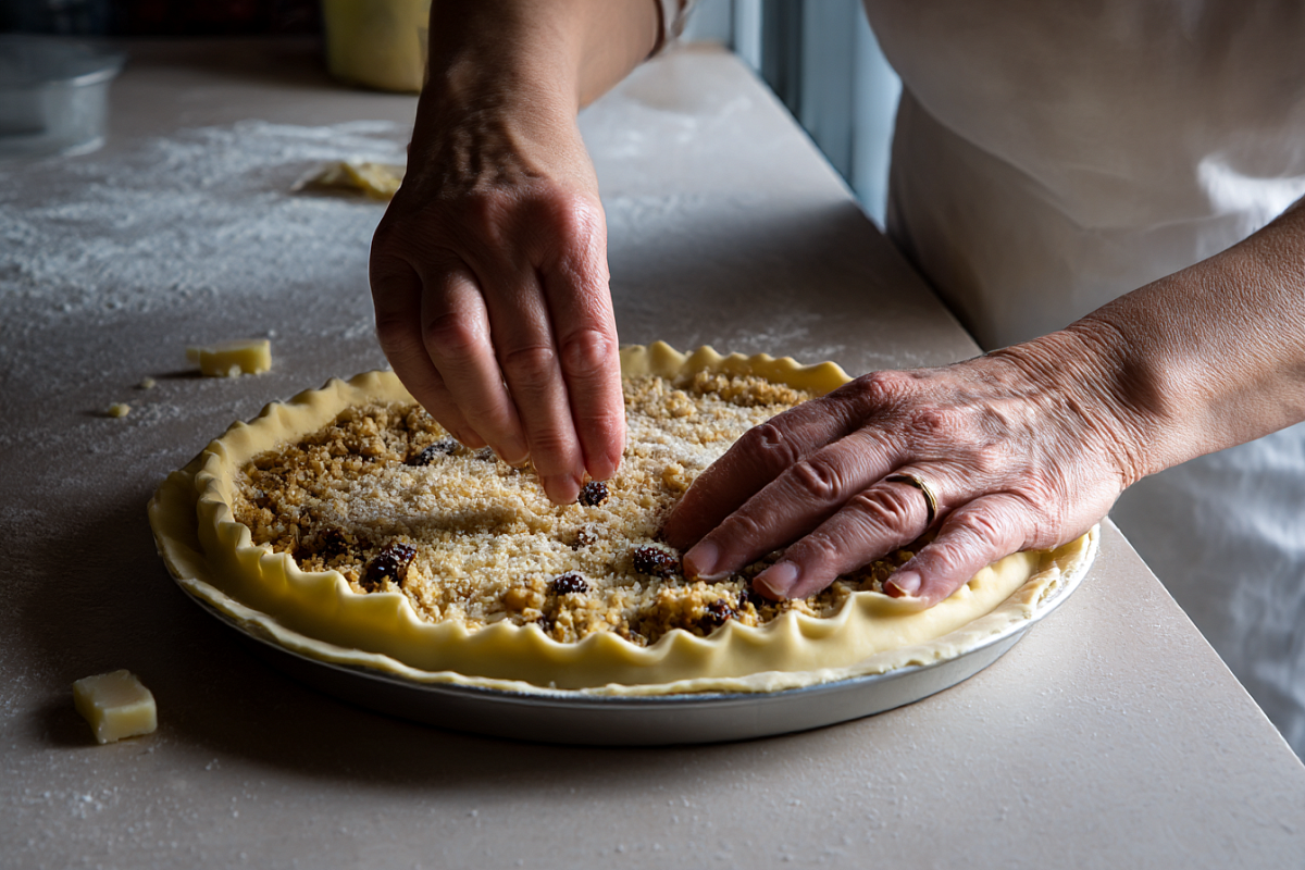 Разделите тесто на большую и меньшую части. Большой пласт раскатайте по диаметру формы ~30 см, уложите, лишнее срежьте. Выложите слоями: половина риса, корт, натёртые яйца, щепотка сахара, затем рис с изюмом. Разложите сверху кусочки сливочного масла. Накройте вторым, тонко раскатанным пластом, плотно защипните края и сделайте небольшой надрез в центре для выхода пара. Сверху присыпьте штрейзелем. Выпекайте при 180 °C 40–50 минут до румяной корочки. Полностью остудите пирог перед разрезанием — начинка стабилизируется и слои будут ровными.