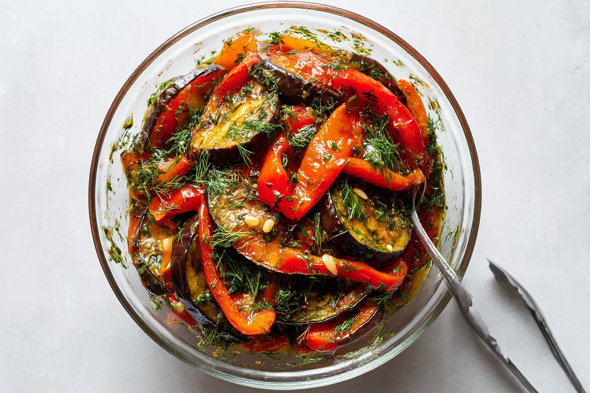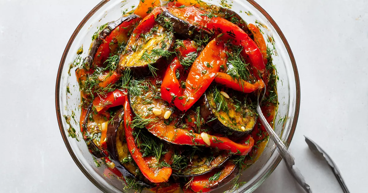 Эта закуска получается такая ароматная и аппетитная, что, как говорят, «язык проглотишь». Перцы запекаются до мягкости, баклажаны — тонкими слайсами, а затем всё соединяется с щедрой горстью зелени и чеснока. Главное — залить тёплым маринадом и дать остыть, а потом выдержать в холодильнике сутки: вкус становится особенно гармоничным и ярким.