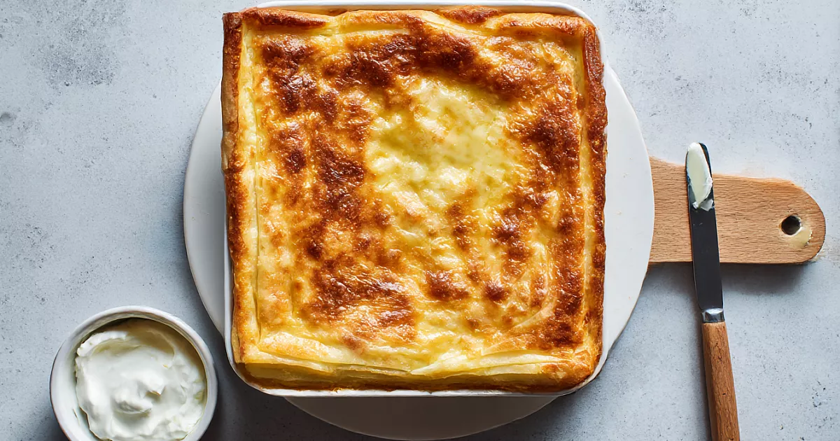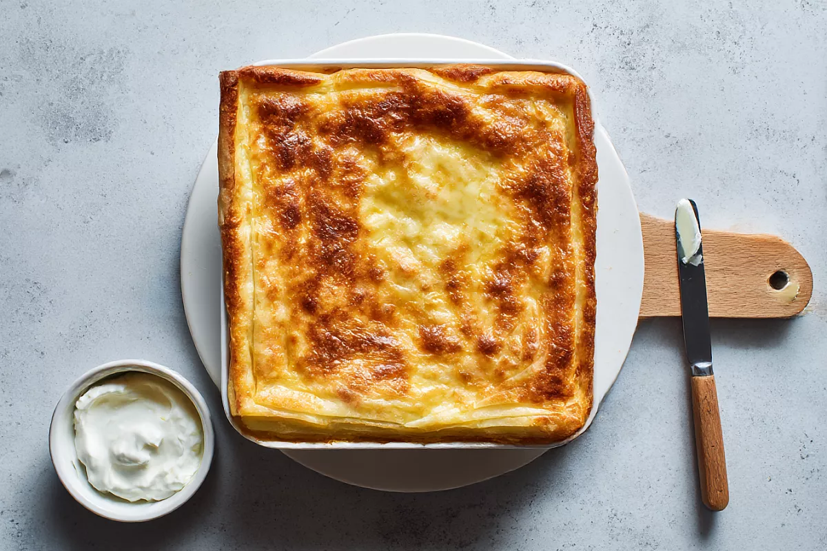 Простой слойный пирог по мотивам ачмы: лаваш, два сыра и заливка, собирается за минуты и запекается до румяной корочки.