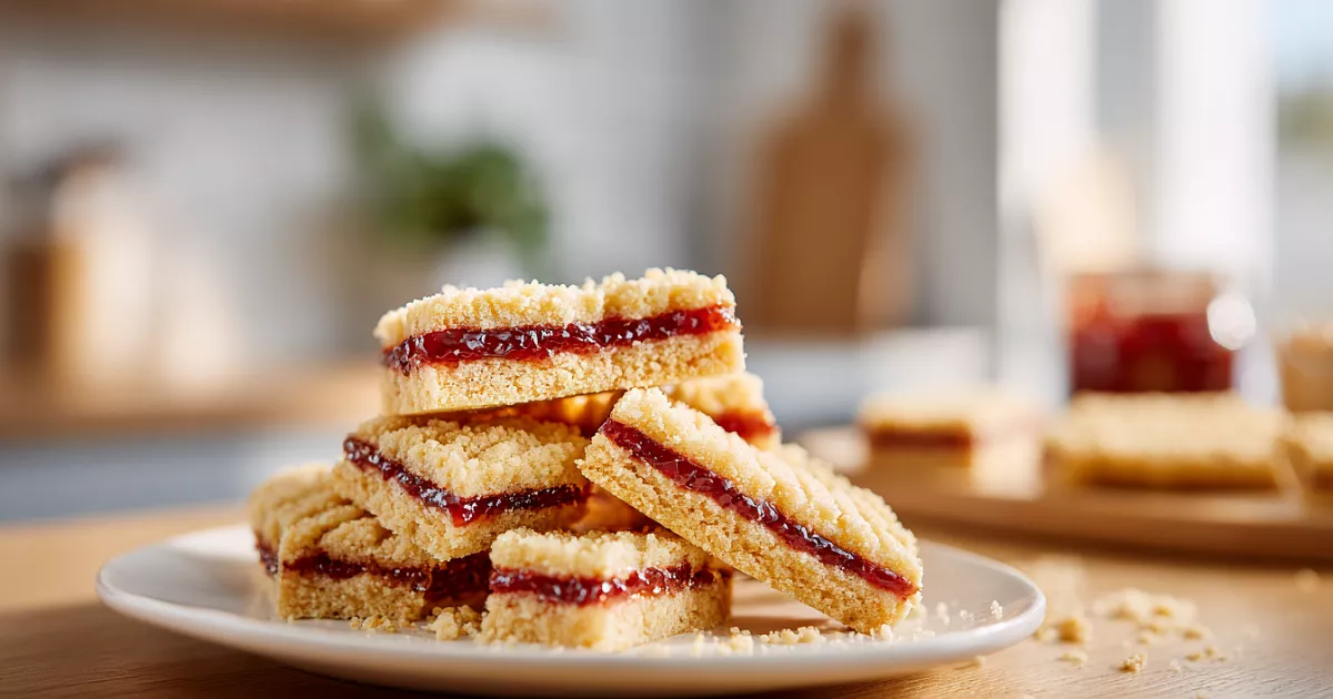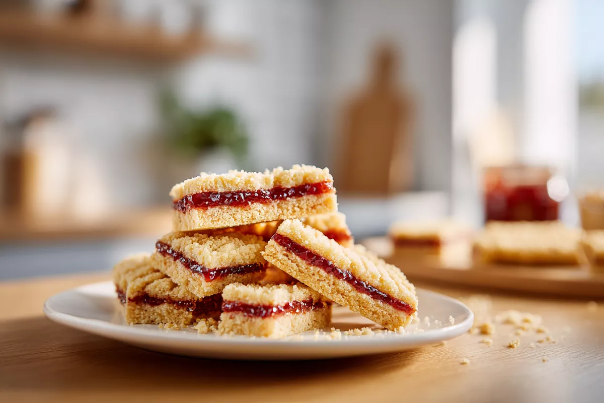 На первый корж выкладывают 200–400 г джема, не доходя до краёв. Накрывают вторым, слегка прижимают. Сверху распределяют остальной джем. Посыпают крошкой из обрезков.