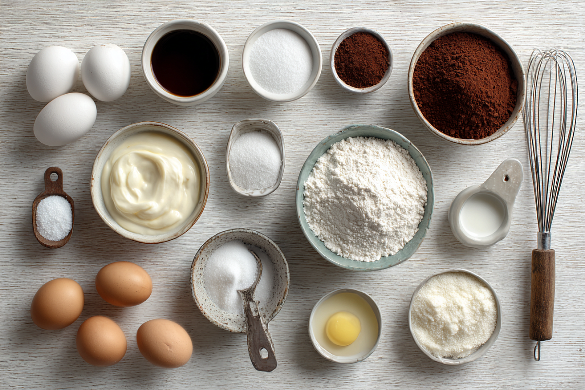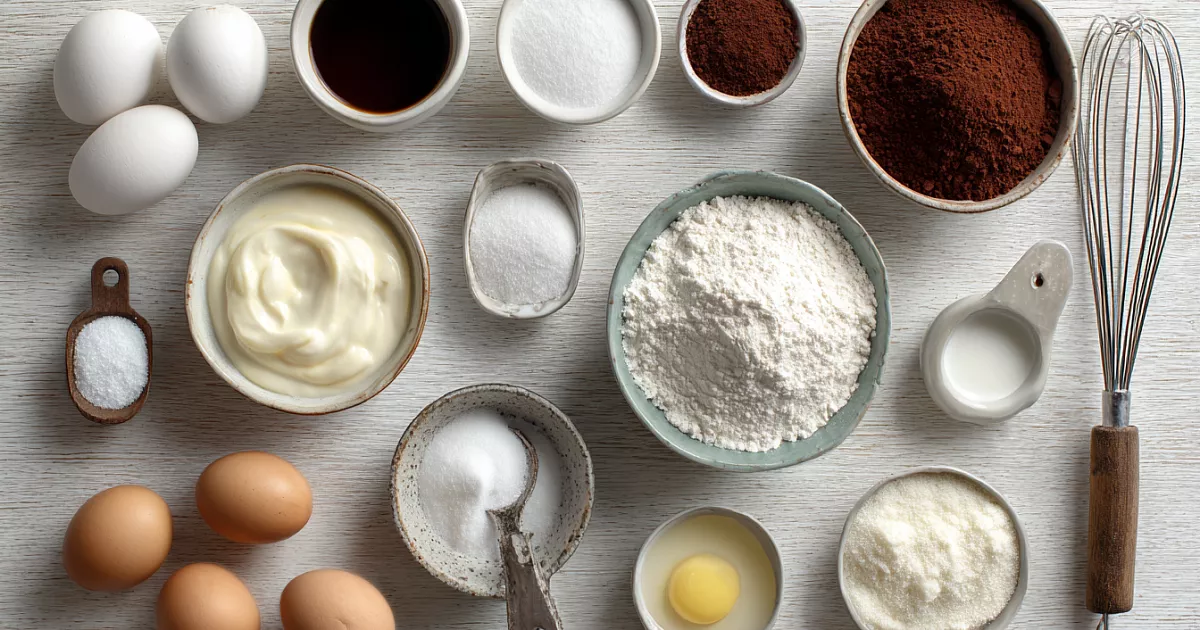 В 250 мл кефира комнатной температуры кладут 0,5 ч. л. соды, перемешивают и выливают в яичную массу. Добавляют 100 мл растительного масла без запаха. Сухие ингредиенты просеивают: 150 г муки, 30–45 г какао, 1 ч. л. разрыхлителя без горки. Замешивают венчиком тесто средней густоты, оно должно стекать лентой.