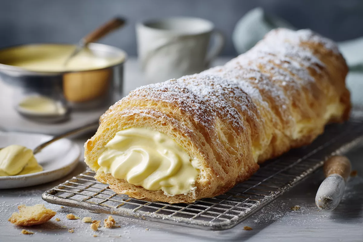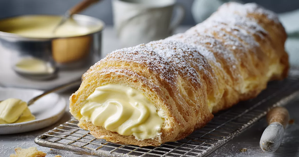 Заварной корж с шелковистым кремом сворачивается в рулет, который напоминает эклеры – просто и эффектно.