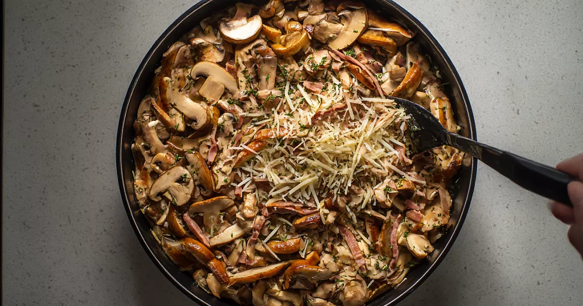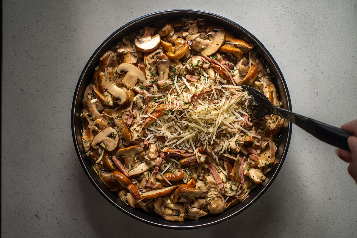 Вся прелесть здесь в простоте и честном вкусе. Грибы слегка подрумяниваются на смеси масел, ветчина даёт аппетитный сок, сверху — щедрый сулугуни. Перчик чувствуется фоном, не отвлекает от сливочной грибной ноты. Так и делают: без лишних специй, чтобы не глушить насыщенный грибной аромат. Подача прямо из керамики, пока сыр тянется — это тот случай, когда разговор за столом сам собой затихает на минутку: слишком вкусно, чтобы отвлекаться.