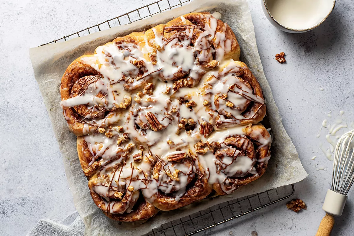 Пока тесто подходит, на кухне уже уютно: раскатываешь пласт, смазываешь маслом, посыпаешь корицей с сахаром — и рулет сам просится в духовку. Готовые булочки я щедро покрываю мягким кремом — он уходит в щёлочки и делает мякиш сливочным. Такие булочки вкуснее именно тёплыми; если остынут, достаточно разогреть около 30 секунд — и аромат снова как из печи.