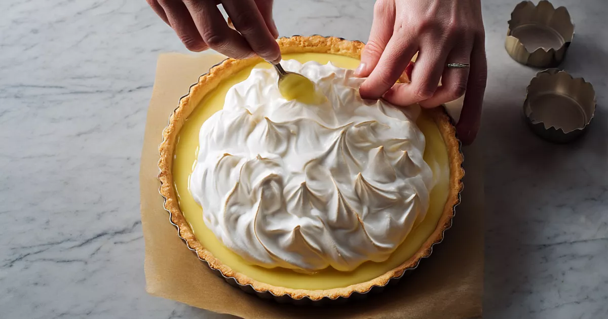 Хрустящая основа, нежный лимонный крем и румяный верх из белков — готовим просто в форме 28 сантиметров при 180 °C.
