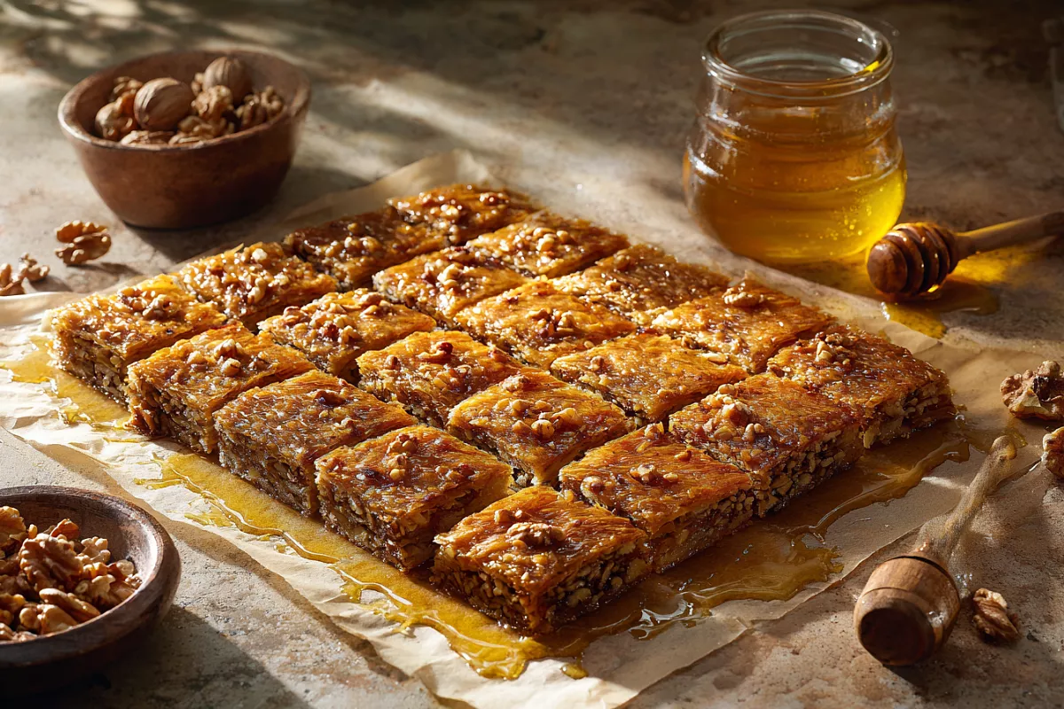 Противень смажьте маслом. Надрежьте пирог на 12 частей, не до конца. Смажьте желтком с молоком. Украсьте половинками орехов. Пеките при 180°C 25–30 минут до полуготовности. Полейте 3 ст. л. мёда. Верните на 10 минут. Остудите – слои видны.