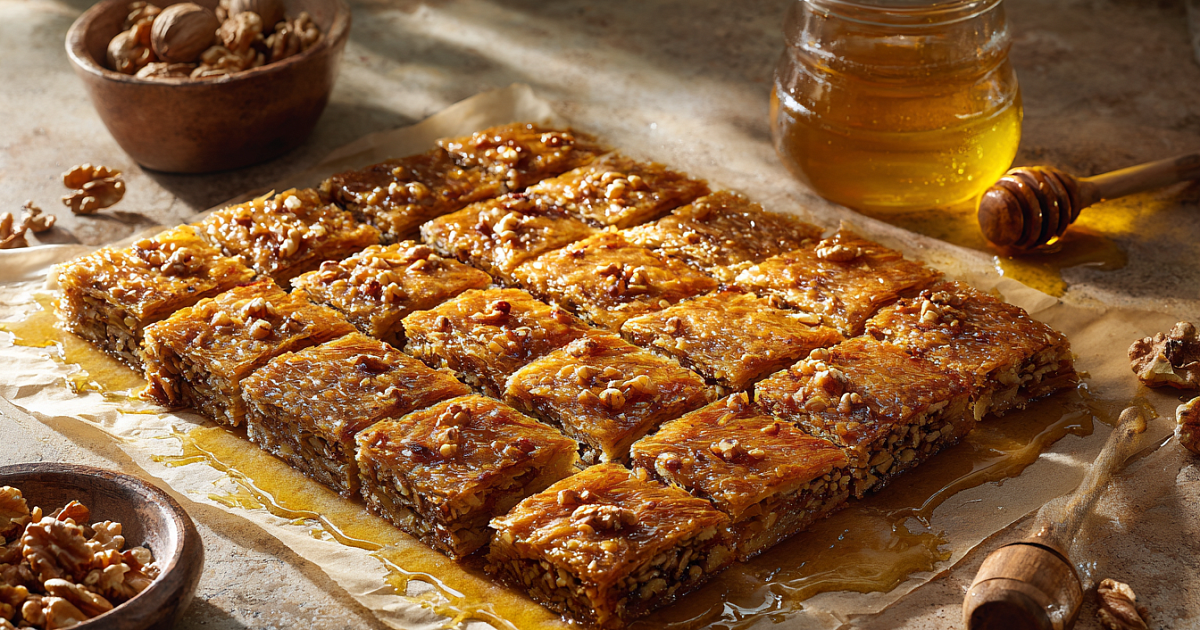 Тесто на кефире с газировкой, тонкие пласты на крахмале, ореховая начинка – шедевр к праздничному столу.