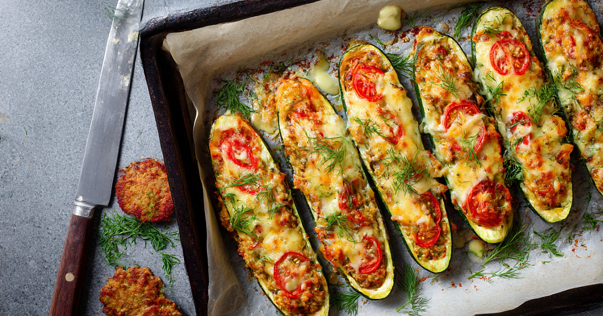 Простые «лодочки» из кабачков: сочный фарш, дольки помидора и тянущийся сыр, запекаются при 180 °C до румяной корочки.