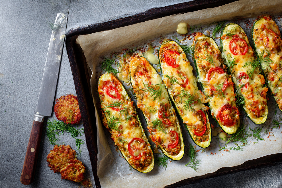 Противень застелите пергаментом, духовку разогрейте до 180 °C. Наполните лодочки фаршем с небольшой «горкой». Сверху уложите дольки помидора, слегка присыпьте свежемолотым перцем и проведите тонкую сеточку майонеза. Запекайте на среднем уровне (верх-низ, конвекция) 35–40 минут до мягкости кабачка. Посыпьте тертым сыром и верните в духовку ещё на 7–10 минут, чтобы сыр расплавился и подрумянился.