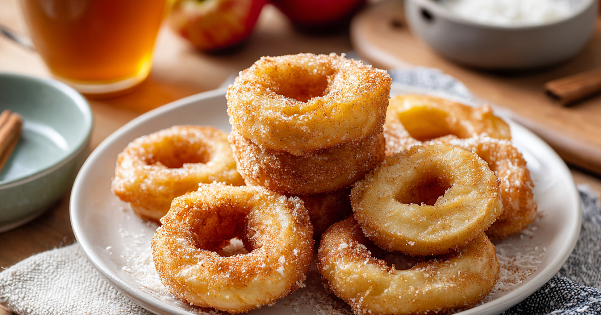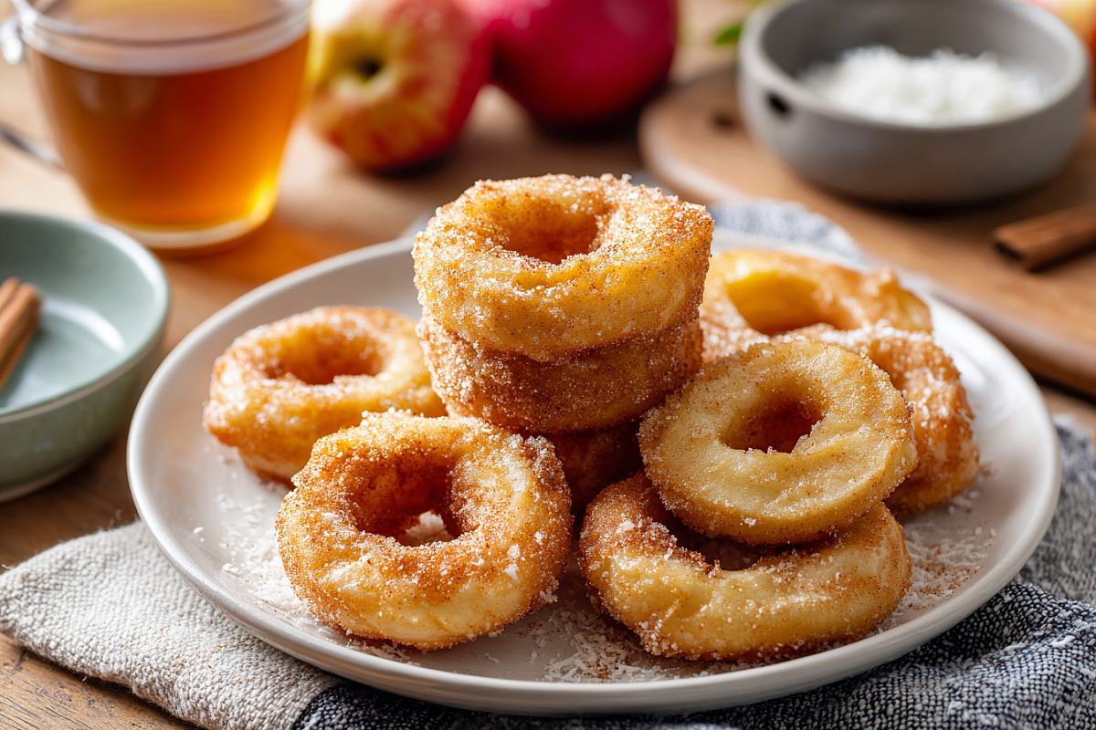 Для посыпки смешиваем 2 ст.л. сахара и 1 ч.л. корицы. Горячие кольца обваливаем в этой смеси с обеих сторон – сахар тает и пропитывает корочку ароматом. Подаём сразу к чаю. Яблоки внутри остаются мягкими и сочными, кляр нежный с кокосом.