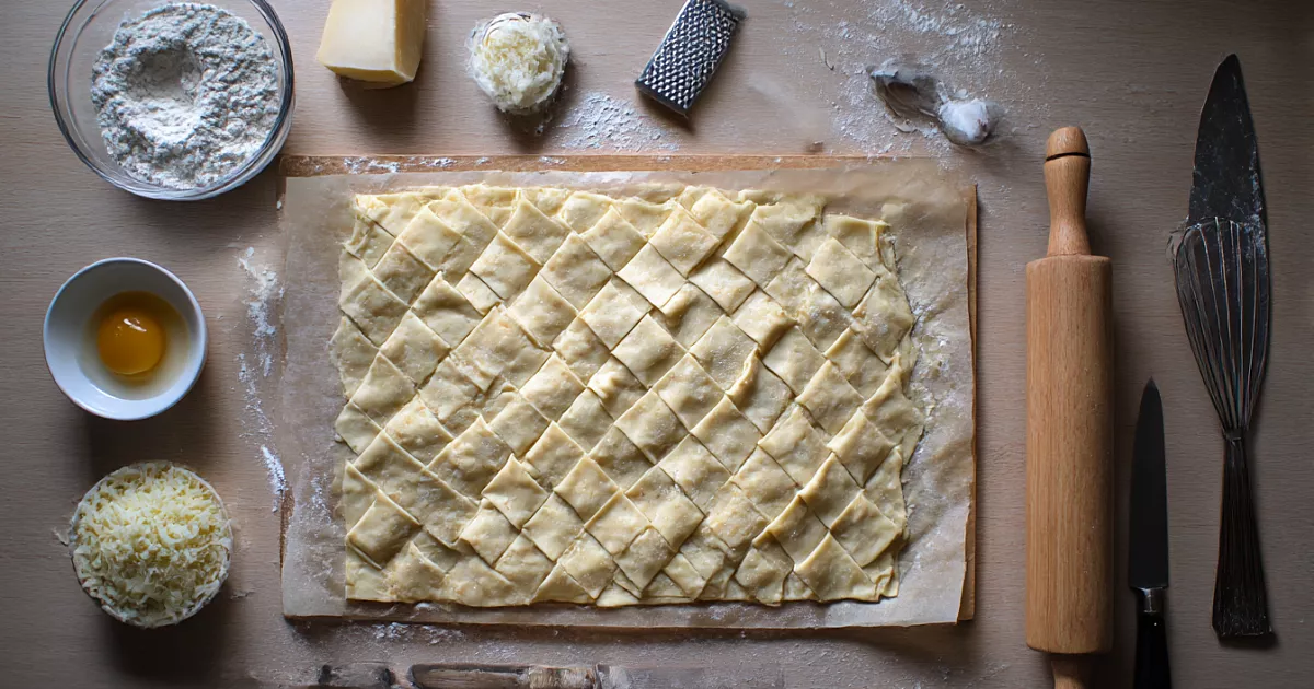 Простые слойки на картофельном тесте: мягкие внутри, хрустящие снаружи, с румяной сырной посыпкой.