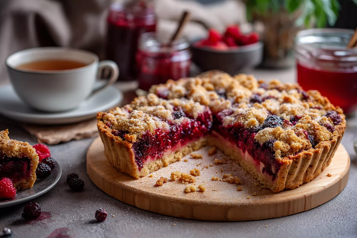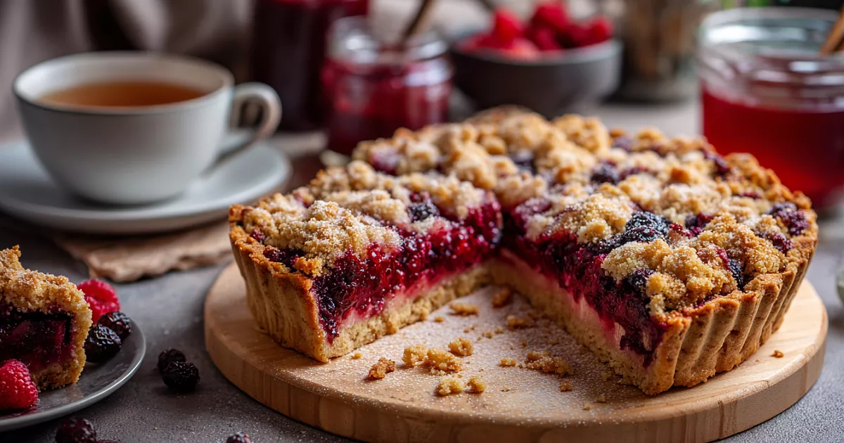 Песочное тесто-крошка с двойным вареньем, смородиной и грушей выпекается 30 минут и пахнет домашним уютом.