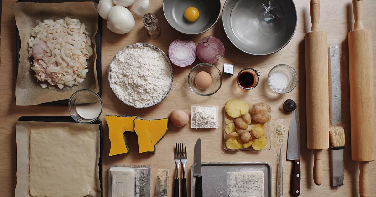 Слоёный, хрустящий пирог без дрожжей и соды: тесто собирается за 10 минут, а начинка — сочная и ароматная за счёт лука, картофеля и тыквы.