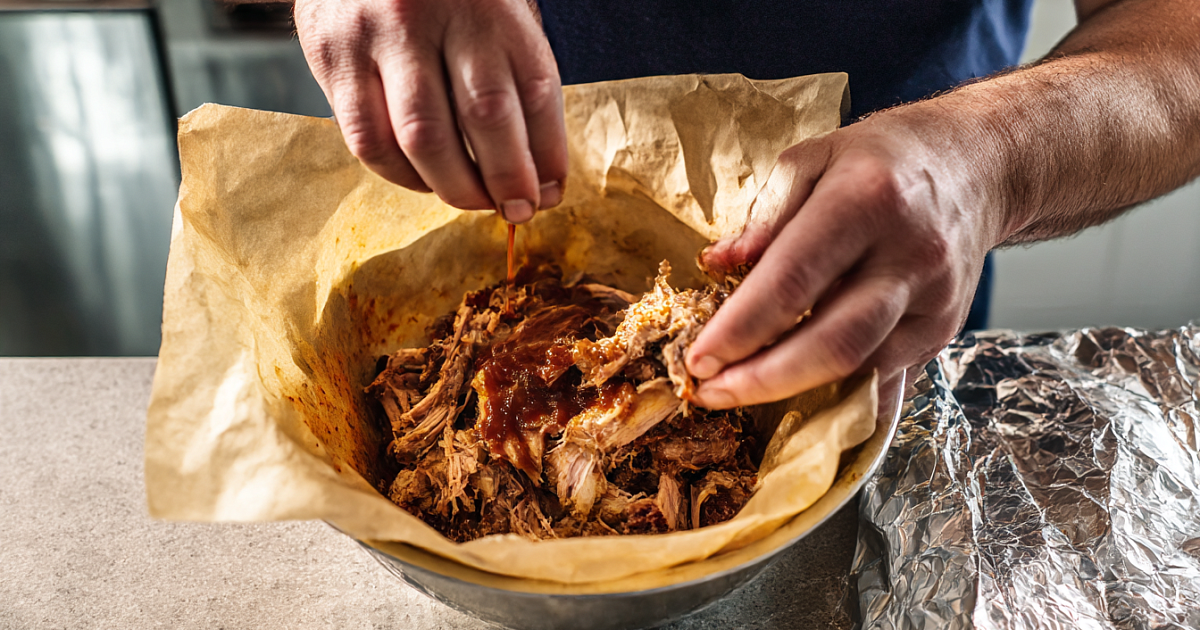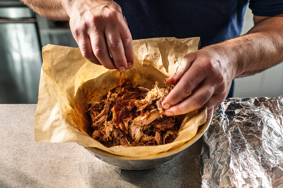 Добавьте свежемолотый перец, немного острой горчицы и несколько ложек разных соусов барбекю. Влейте часть выделившегося мясного сока — регулируйте сочность «под себя». Перемешайте до состояния «барбекю-каши» — ароматной и блестящей. Если нужно — досолите (помните: соусы уже солёные).