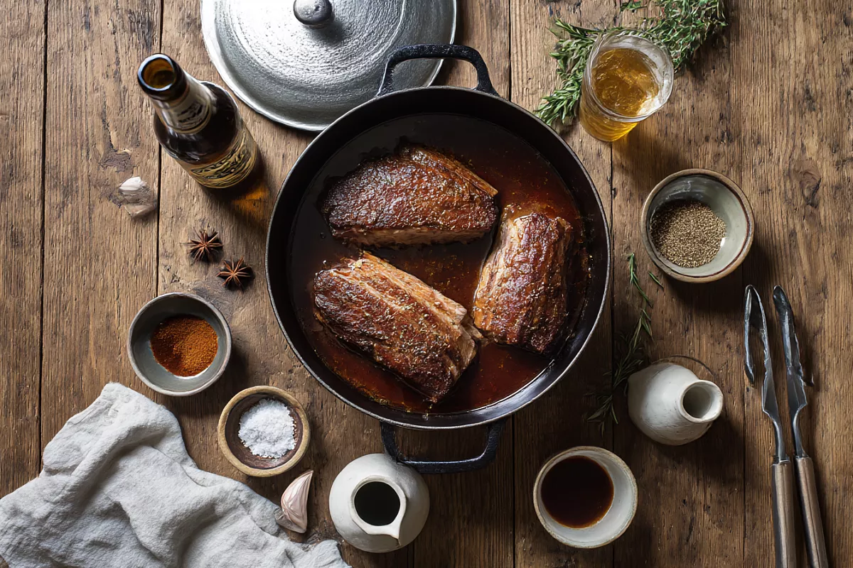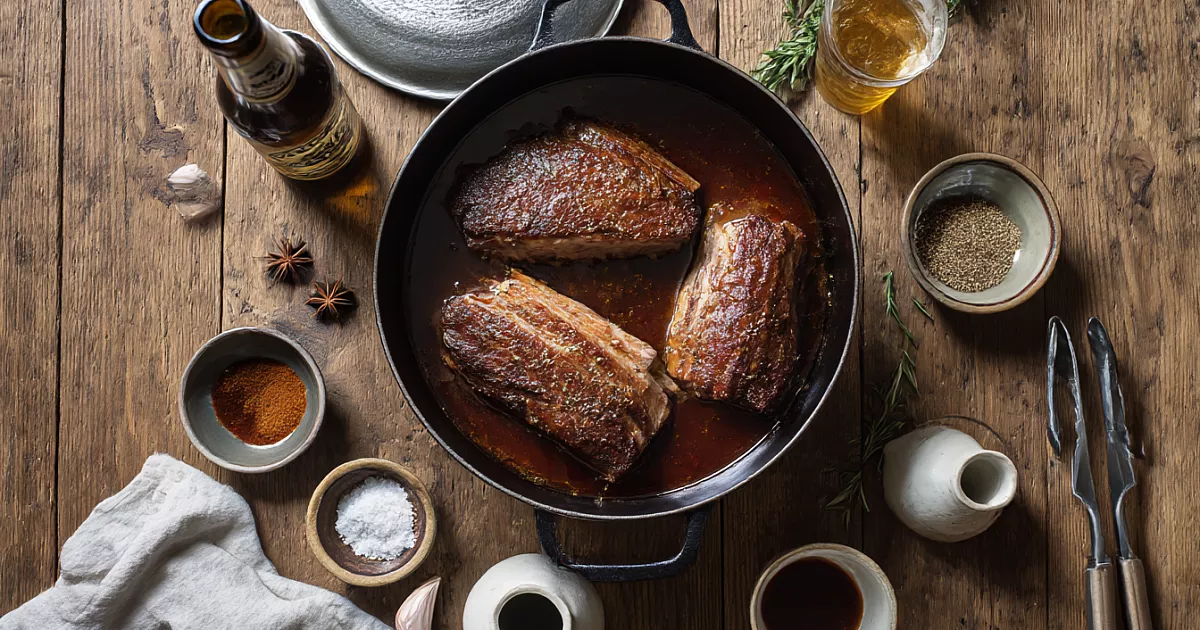 Готовка элементарная: я беру недорогую грудинку ( цена — 500 руб./кг), соль и перец — и без масла, потому что свинина отдаёт свой жир. Заливаем светлым пивом (можно безалкогольным), добавляем специи и томим до загустения. По времени выходит около 2 часов: примерно 1 ч 45 мин томления плюс разворот и финальные 10 минут под крышкой. Результат — нежное мясо, хрящики буквально распадаются; идеально класть на ломоть хлеба.