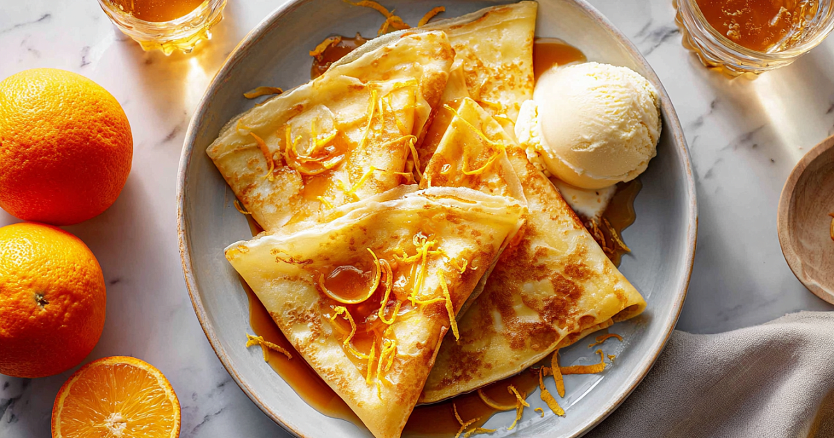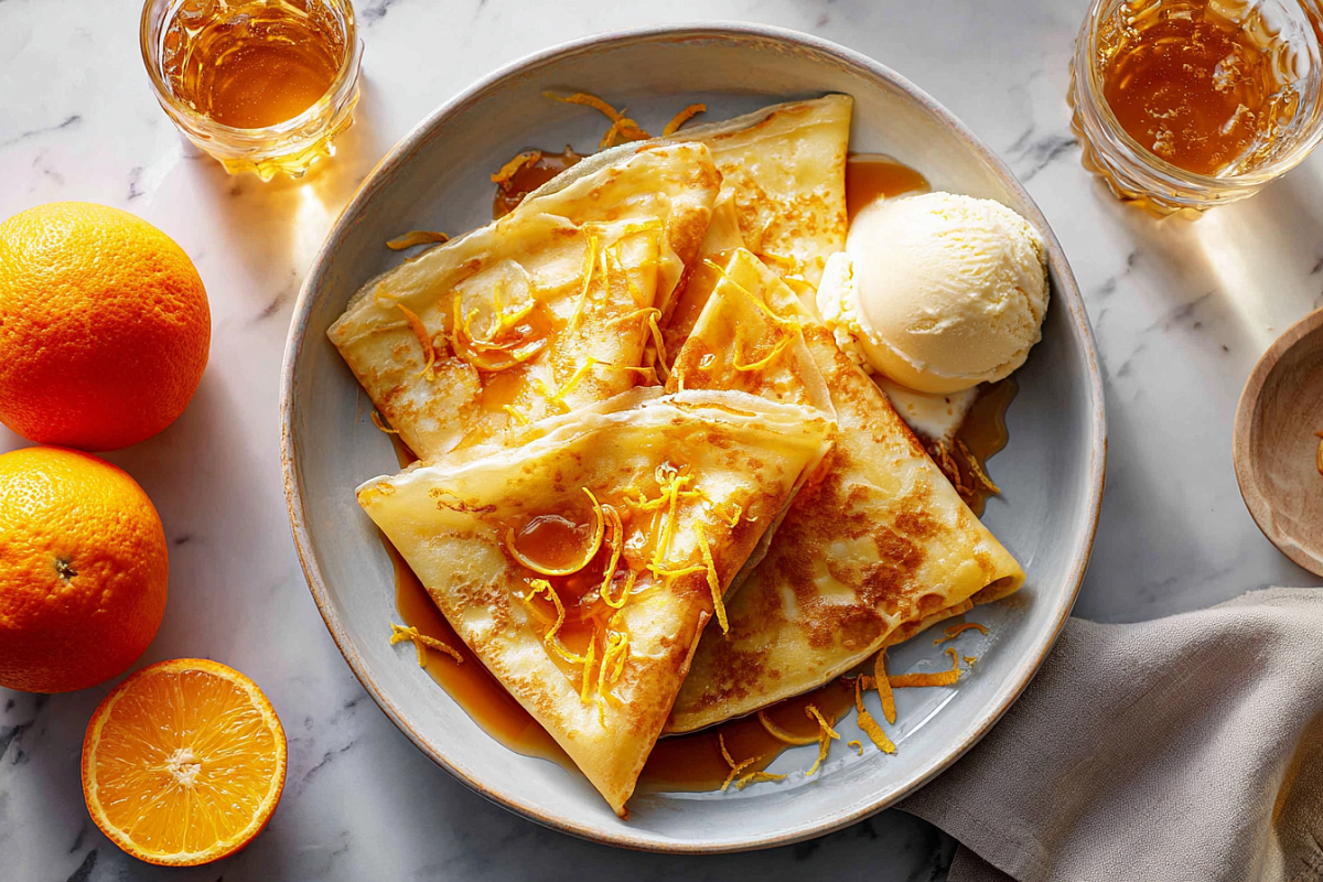 Тонкие блинчики пропитываются ароматным апельсиновым сиропом, фламбируются коньяком.