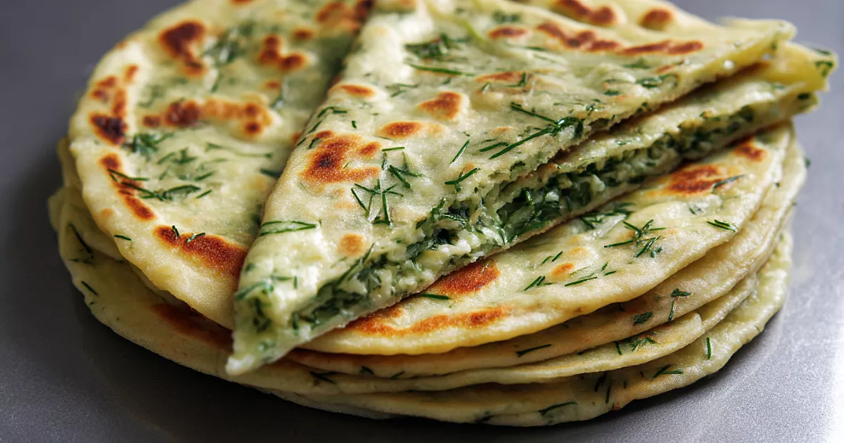 Основа успеха здесь простая: тесто замешивается на воде с щепоткой соли и ложкой масла, хорошо отдыхает и потом раскатывается — тонко-тонко. Начинка — зелень и рассольный сыр (или творог) — получается сочной, но не мокрой. Лепёшки жарятся на хорошо раскалённой сухой сковороде до лёгкой «подушки» от пара, а уже готовые смазываются маслом — так они остаются мягкими и ароматными даже в холодном виде