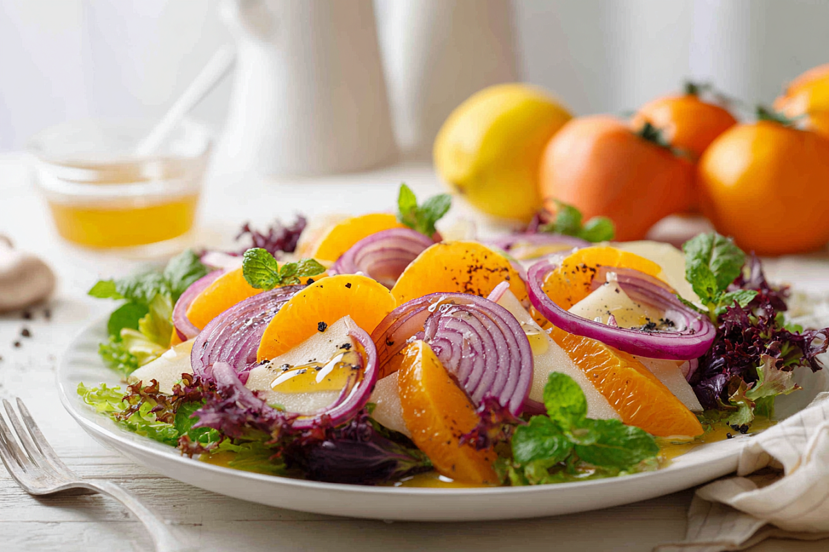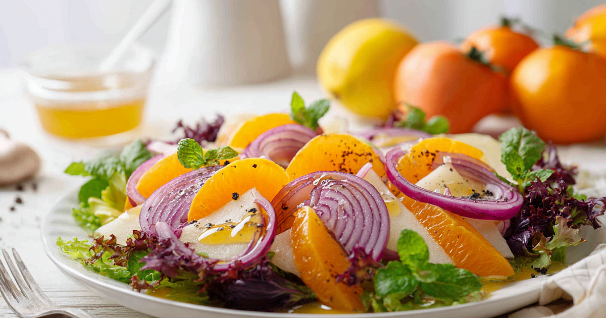 Простой праздничный салат: маринованный ялтинский лук, сочное яблоко и спелая хурма с мятой. Готовится за минуты.