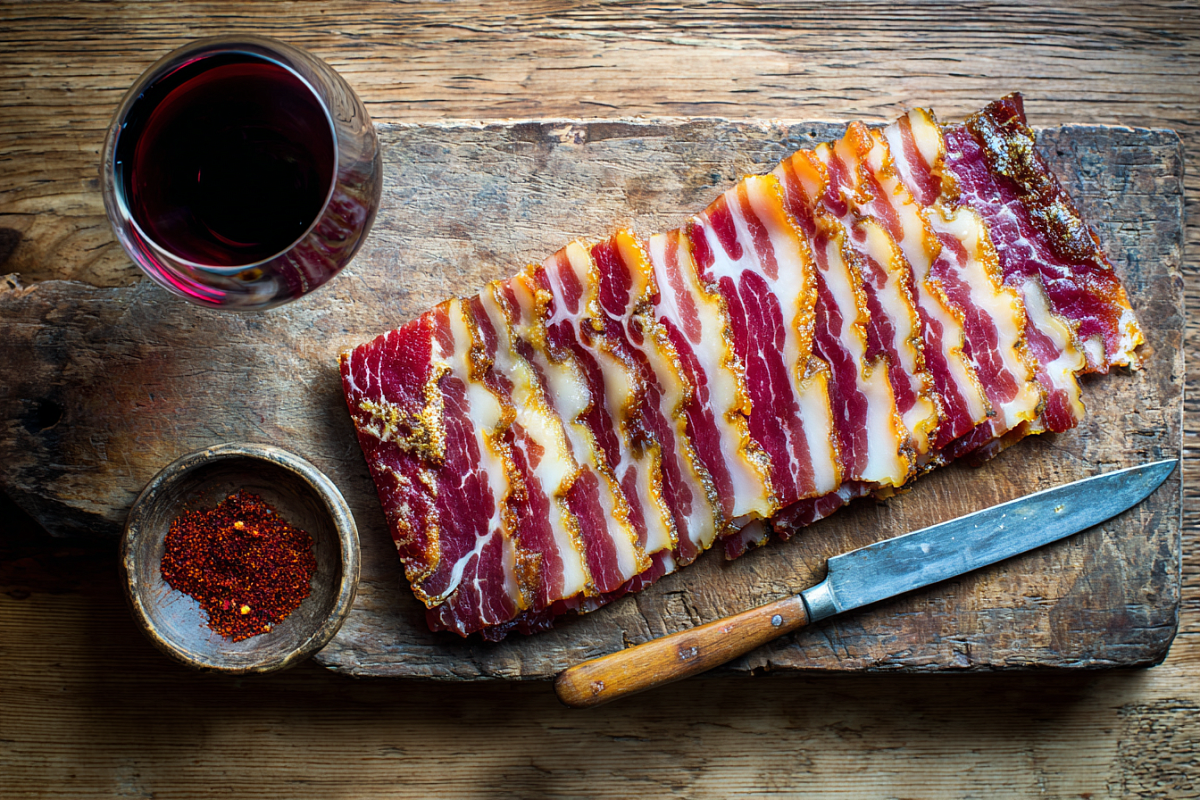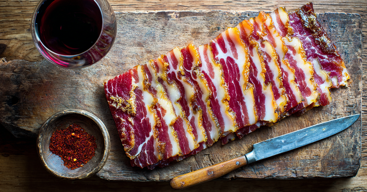 Эта традиция пришла из семейной кухни: берут свежую грудинку, щедро пересыпают солью, затем промывают, обсушивают, покрывают паприкой и подвешивают при низкой температуре и умеренной влажности. Важнее всего — точный посол на 16 часов (чтобы не пересолить) и правильные условия с циркуляцией воздуха. Готовность удобно проверять «щипком»: тонкие края твердеют раньше, центр должен стать упругим с лёгкой отдачей. После выдержки достаточно счистить излишки паприки, нарезать тонко — и наслаждаться.