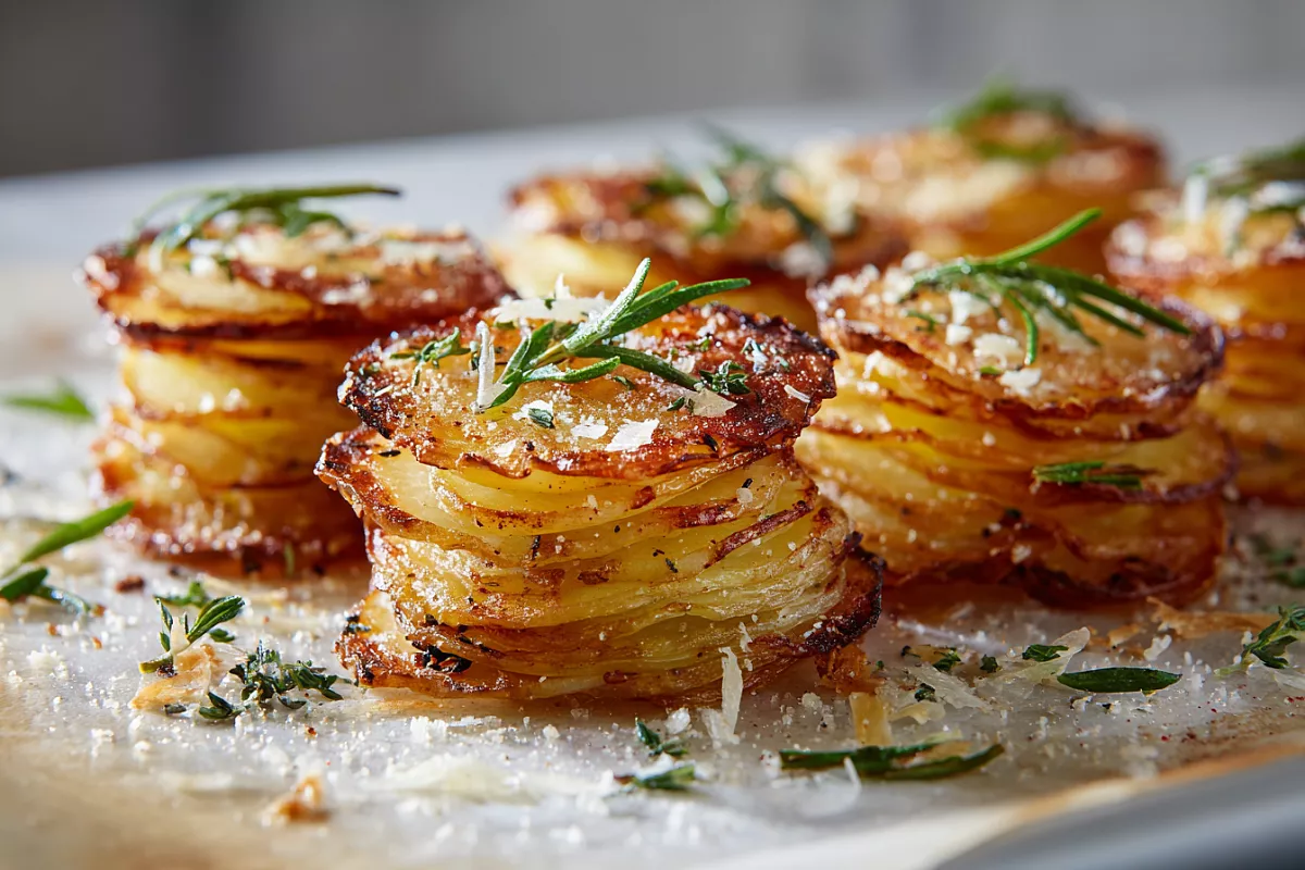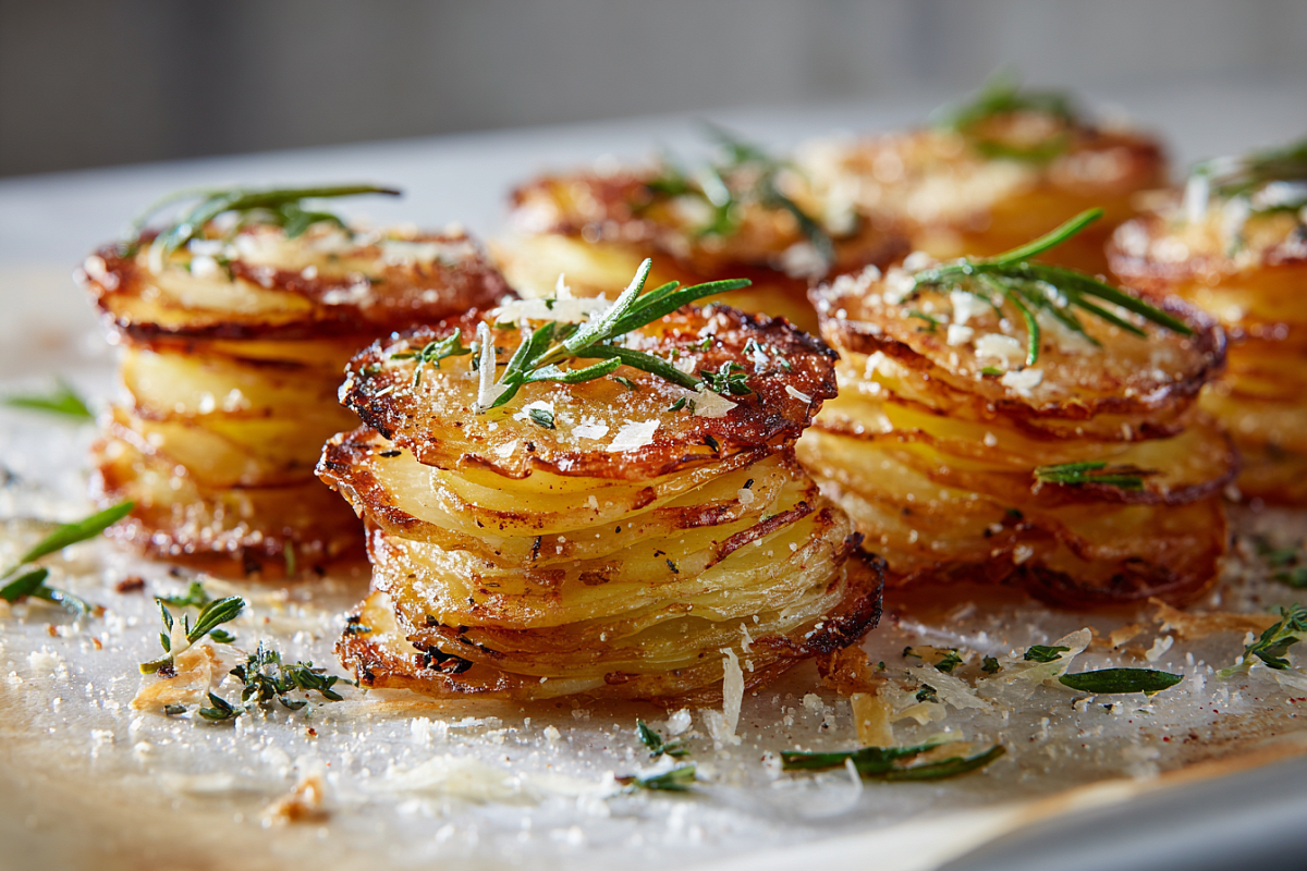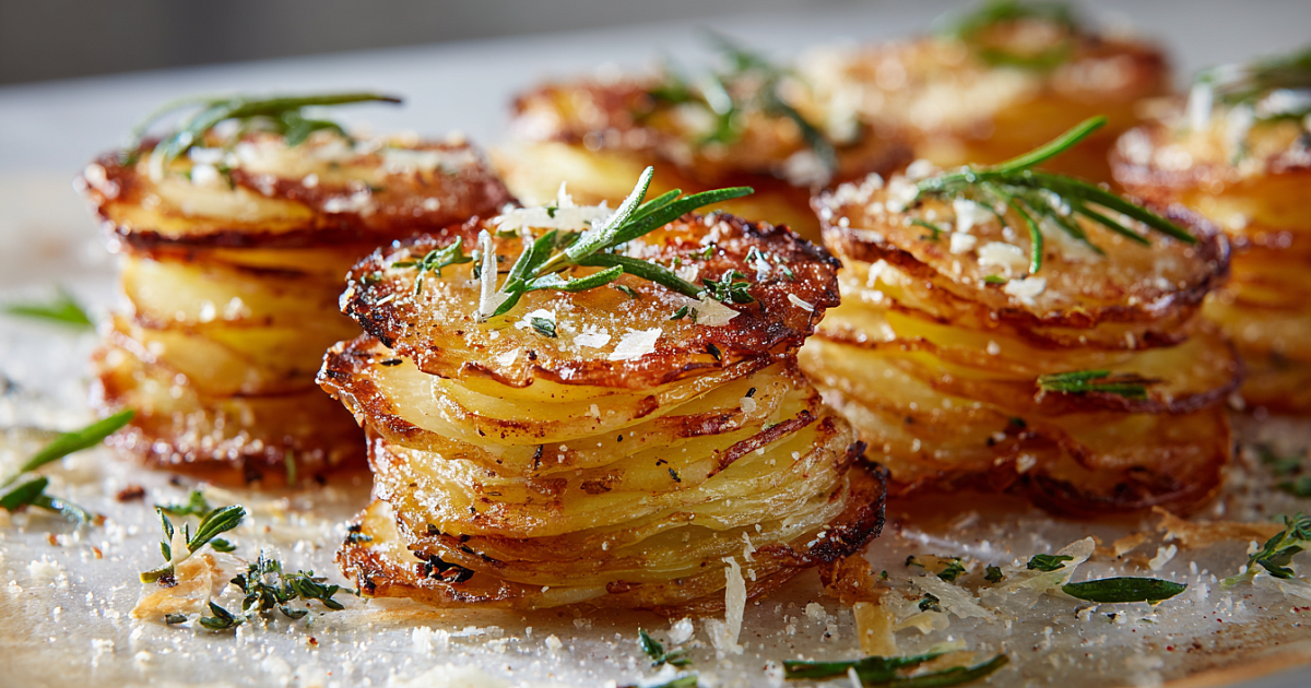 Нежная сердцевина и золотистая корочка: запечённые башенки из тонких ломтиков картофеля — простой, но эффектный гарнир.