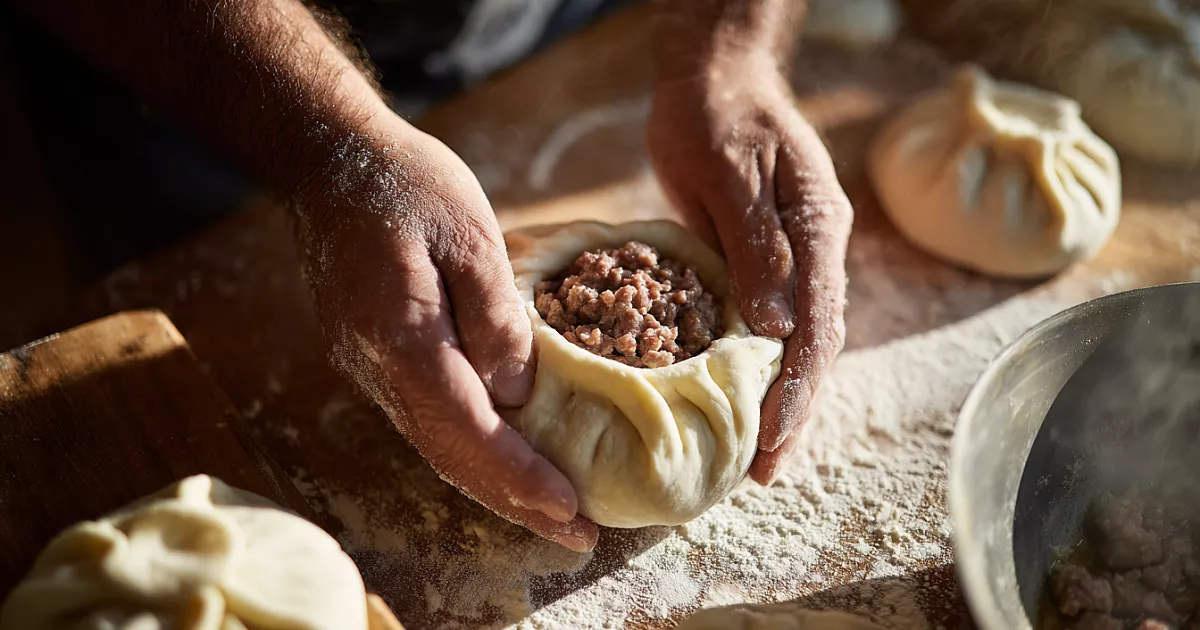 Подошедшее тесто разделите на кусочки по 50 г и скатайте шарики. Раскатайте лепёшки толщиной около 3–4 мм, положите в центр 30 г фарша и слегка прижмите. Края защипывайте к центру, оставляя небольшое отверстие — «окошко», как у хинкали, но открытое. Перед жаркой дайте заготовкам постоять 10 минут для лёгкой расстойки.