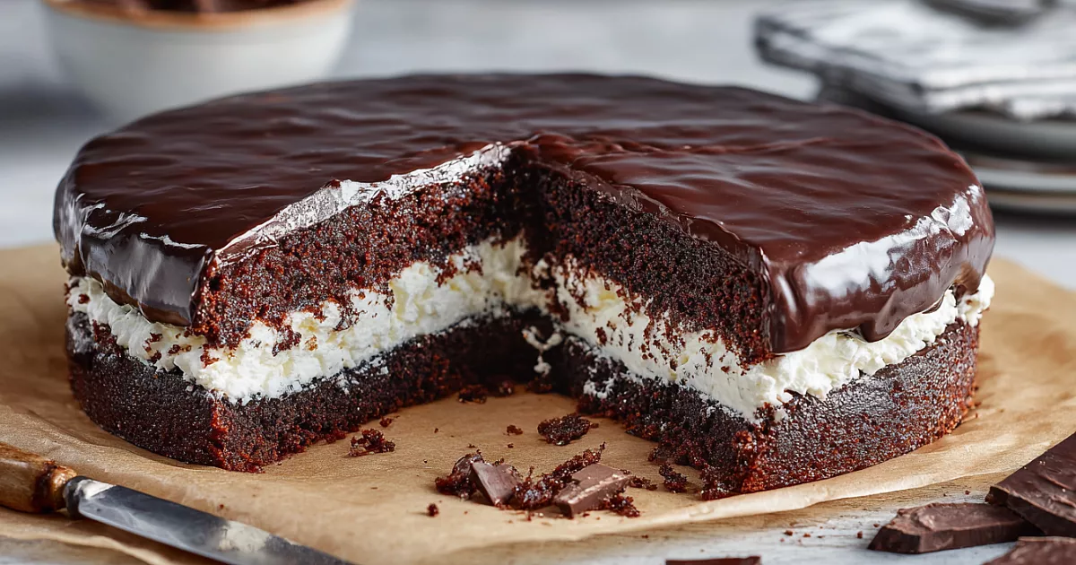 Этот торт напоминает знаменитое пирожное, но вкус куда богаче: влажный бисквит с лёгкой кислинкой, воздушный белково-зефирный крем и тёмный шоколадный верх. Крем здесь на основе итальянской меренги с добавлением желатина — он тает во рту, но прекрасно держит форму. В разрезе получается контраст: плотные коржи и нежная белая прослойка, словно суфле.