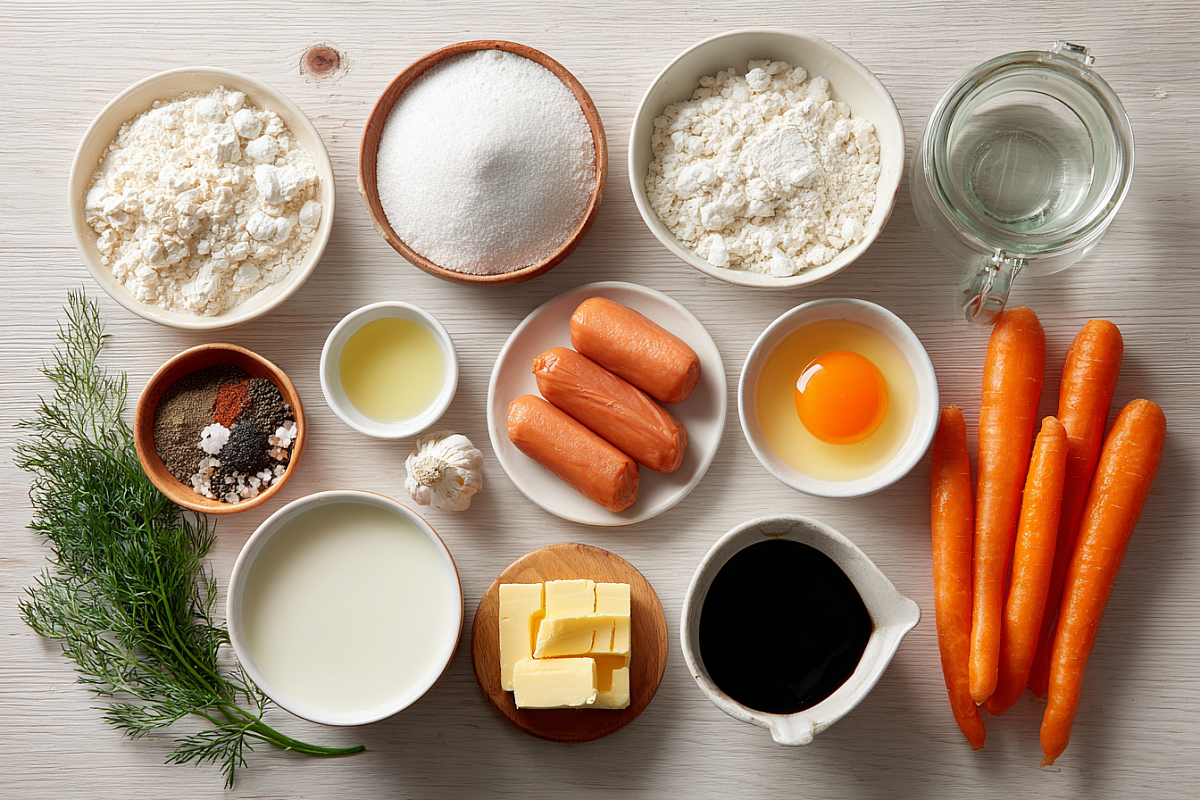 Каждый колобок раскатываем в жгут длиной с сосиску. Выкладываем на противень с пергаментом. Расстаиваем 15 минут. Кладём сосиску в центр, вдавливаем. Смазываем яйцом с водой. Выкладываем морковь, сыр. Делаем сетку соусом. Расстаиваем 7–10 минут.